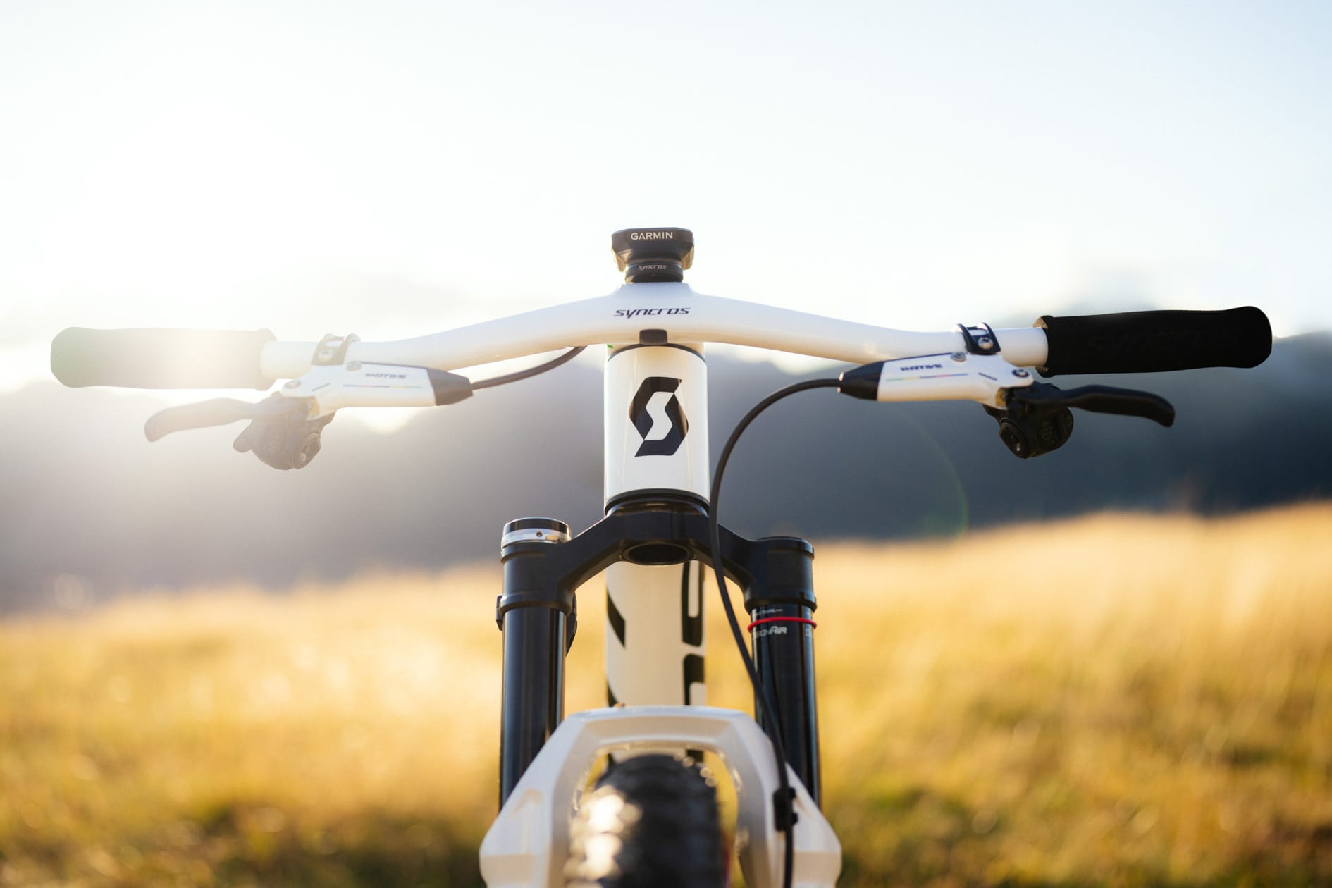 Stopping duties are covered by SRAM’s relatively Motive mineral-oil brakes, these too have received the custom treatment being decked out in white with the rainbow stripes. As is pretty common these days in the XC world Schurter has a Rockshox Reverb AXS dropper post fitted (100 mm of drop).