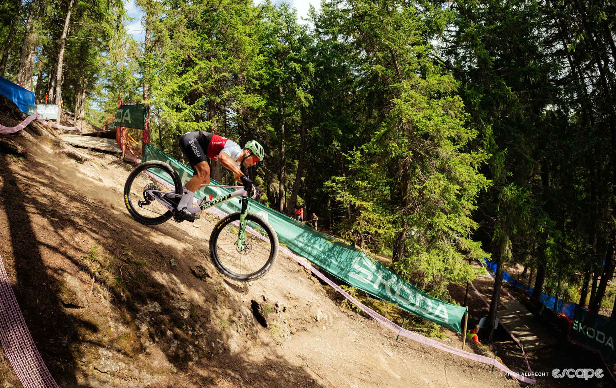 Scott-SRAM rider Filippo Colombo tips into the waterfall section, easily the steepest section of the track could be at home on an enduro course.