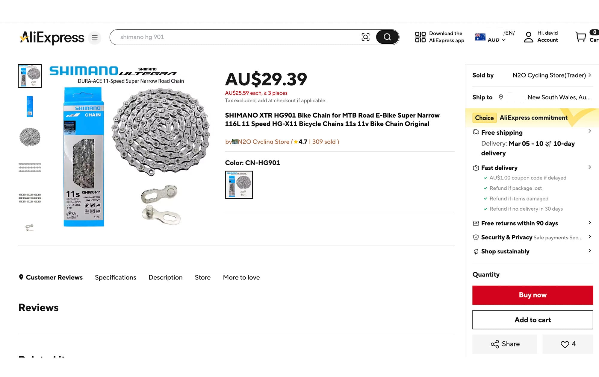For the test, I didn’t want to just buy the blatantly fake chains that cost $10 on Temu; rather I sought chains that could be honestly mistaken as real. I bought one on eBay (store jw-sport-factory) for AU$62.69 (approx US$40). I bought the other counterfeit chain from AliExpress (store N2O Cvcling Store) for AU$30 (US$20) which claimed to be authentic, even showing a Shimano anti-counterfeit authenticity sticker in the photo. I also considered ordering one from Amazon, but they were import-only with long lead times and priced at nearly double the price of the real deal – odd.