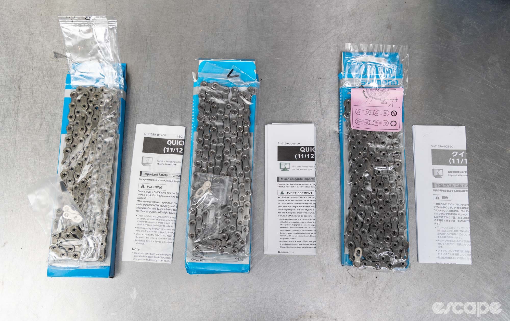 Within the cardboard boxes are more differences between the real and counterfeit options. The sealed plastic around the chain is different, but most apparent is that the quick links of authentic Shimano chains are packaged separately, while both counterfeits had the master links in the bag with the chain.