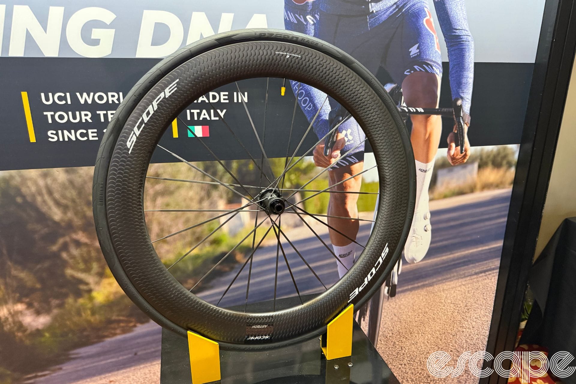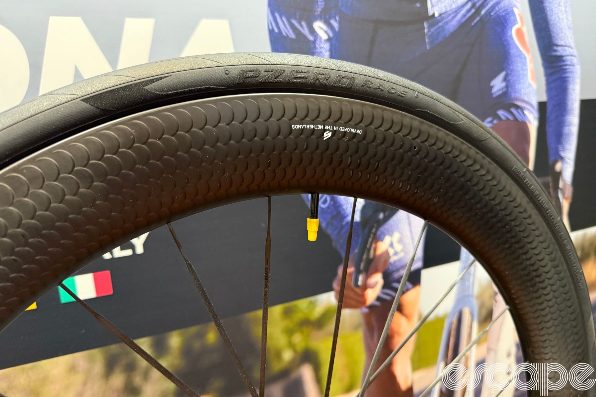 Pirelli was showing off its latest P Zero Race tyre with a new sidewall design. The tyre looks to be the same as the existing P Zero Race with the design on the sidewall now matching that of the brand's premium automotive tyres.