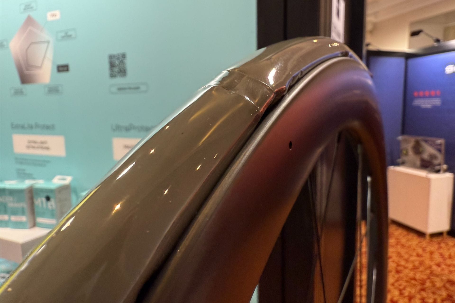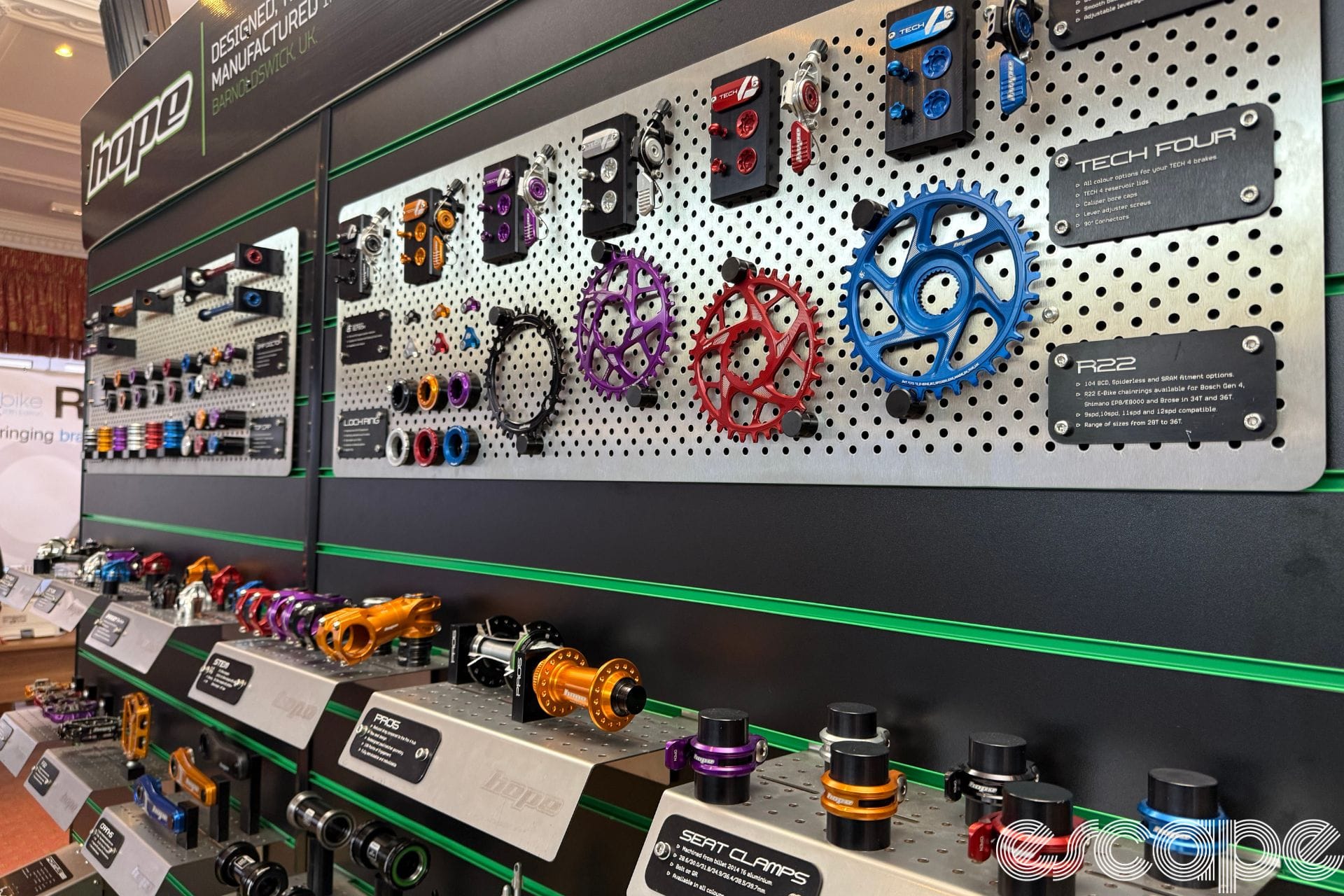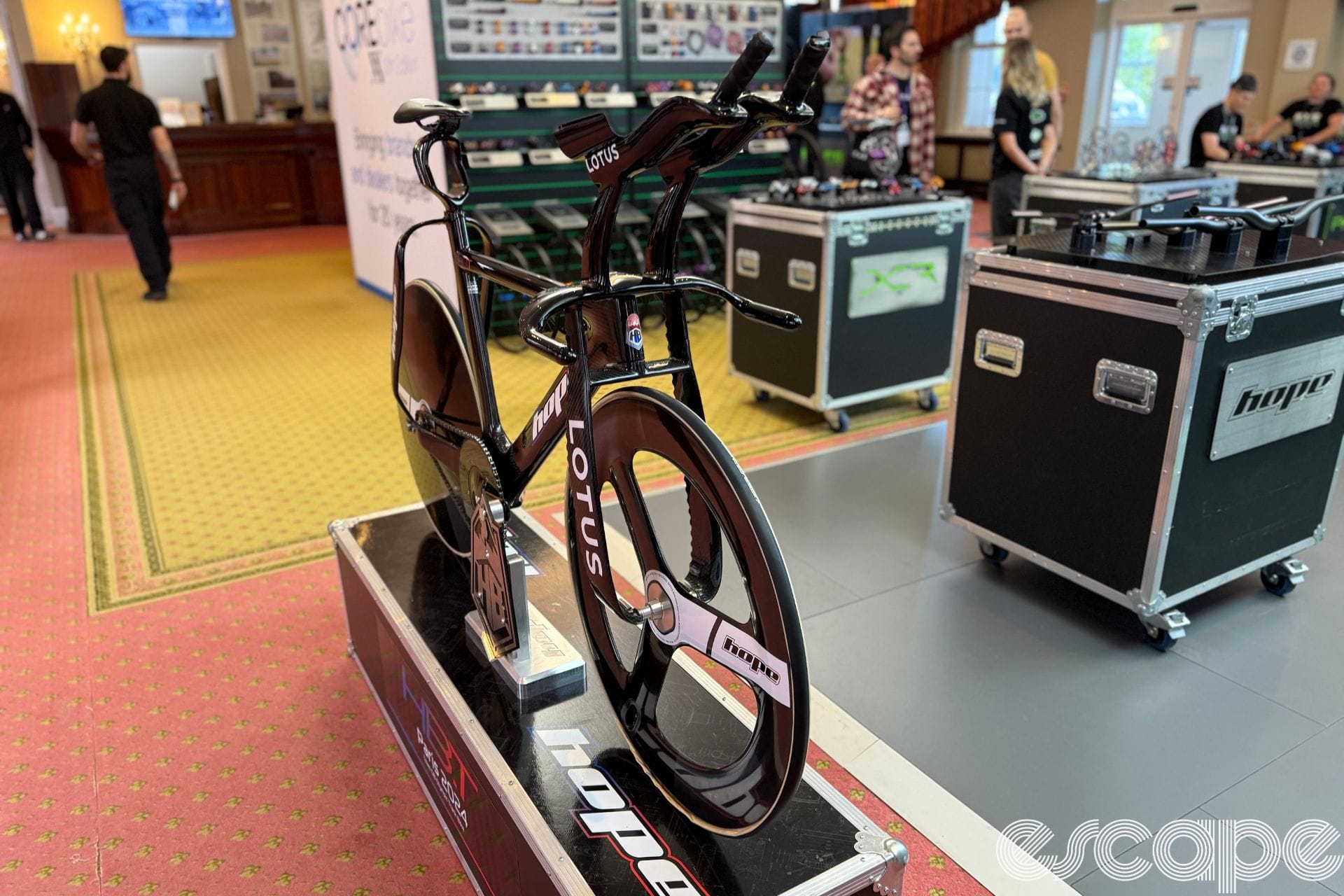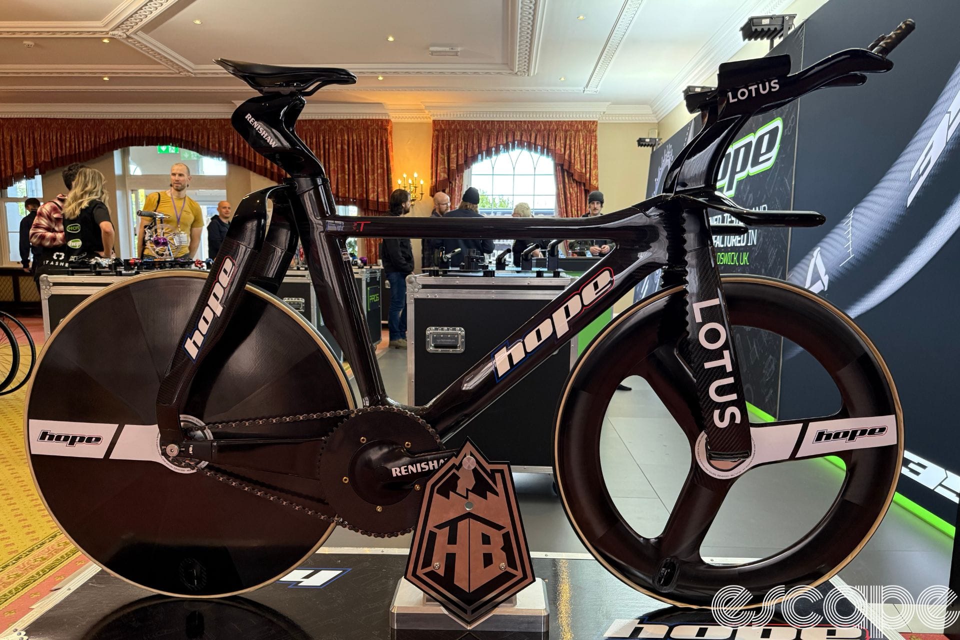 It wasn't just anodised parts Hope had on display. The Hope/Lotus HBT was also being shown with its super wide stance fork and seatstays along with a split seat post. Although the initial HBT was raced at the Tokyo Olympics in 2021 the bike still looks futuristic.