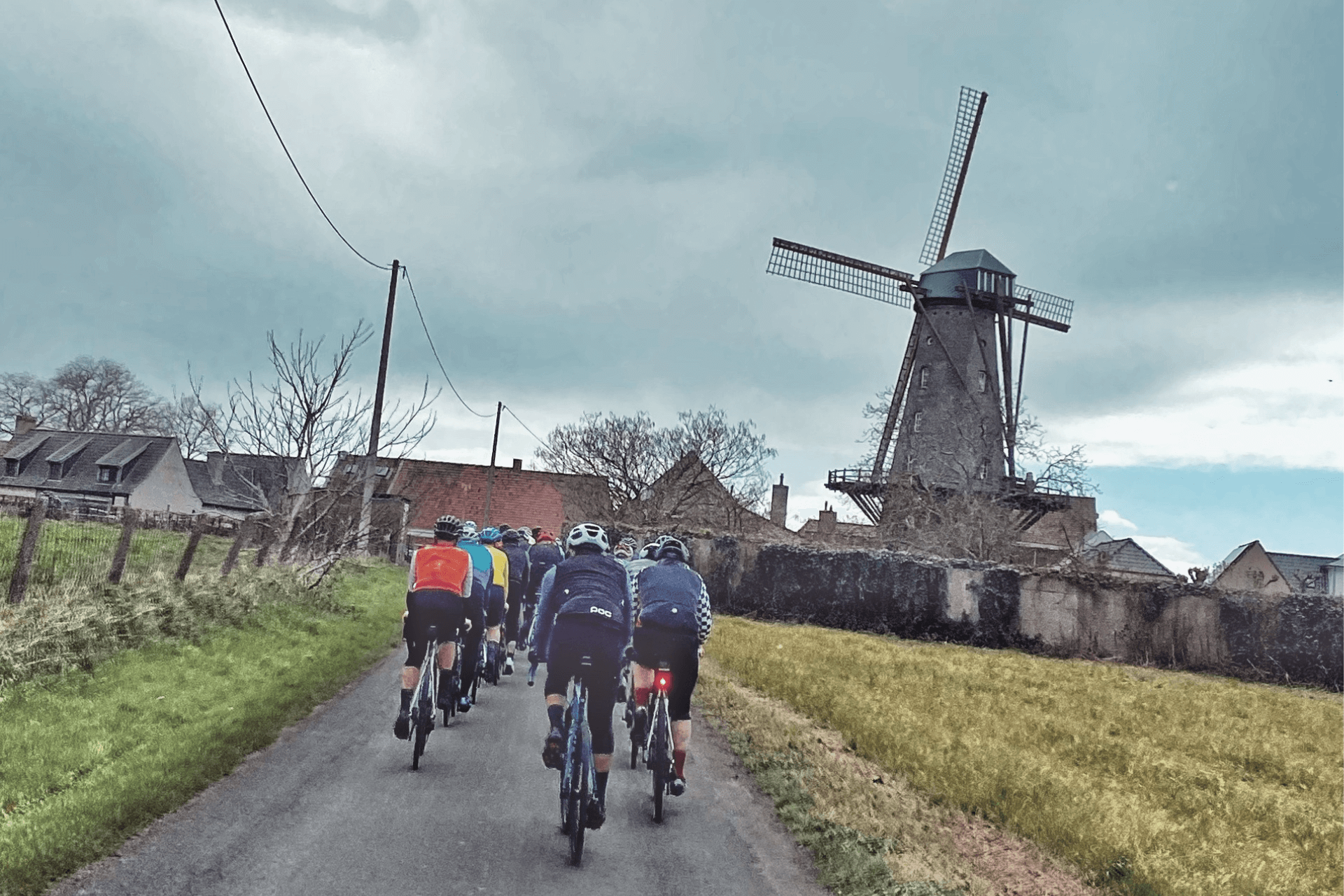 About half of the Summit members showed up with gravel bikes. Roubaix's cobbles would prove this to be a wise choice. Photo: Al JohnsonAndy van Bergen holds court as the 30-odd Summit members and ride leaders loiter in front of the Parkhotel Kortrijk lobby. Photo: Geoff LiuOne of Belgium's countless ploegstraat (farm roads) and windmills. Photo: Felix Brill