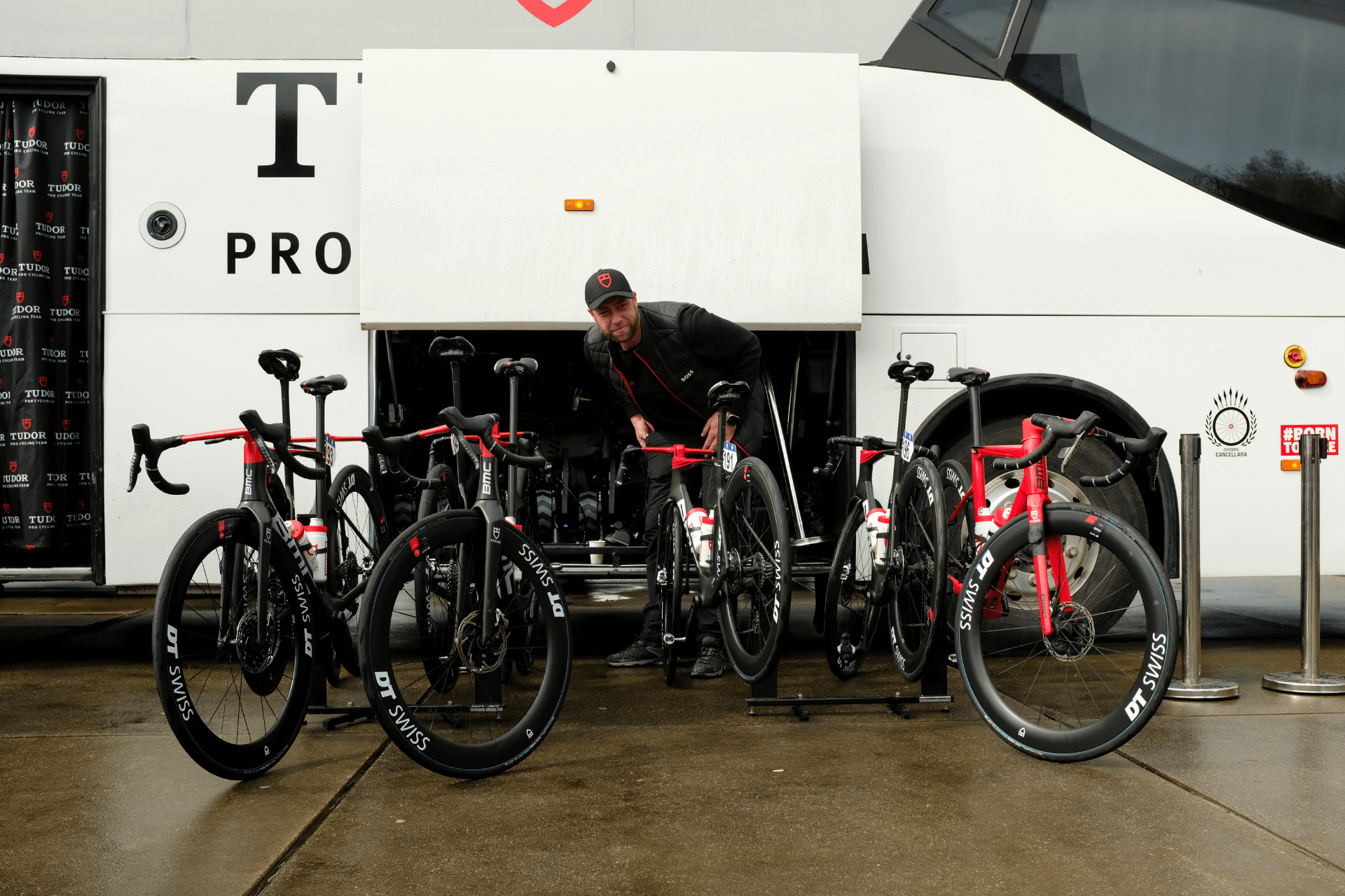 A Tudor team mechanic attends to various BMC Teammachine Rs and SLR01s. Photo: Khue CaiA few Escapees joined Ronan Mc Laughlin and Caley Fretz for a tour of the Scheldeprijs pits. Photo: Felix BrillCaption this. Photo: Dean MurpheyI've recently learned the term "goblin core" and while we couldn't tell you what it means, this courtyard in Brugge has it in spades. Photo: Dean MurpheyAl Johnson auditions for the cover of Spin Cycle. How do you rate his Blue Steel? Photo: Khue CaiIt's 10 PM on a Wednesday, but the evolving story about the chicane at the entrance to the Troué wasn't going to write itself. Several Escapees, including the Two Petes (Waldron and Bryan), were on hand to witness the sausage being made in real time.