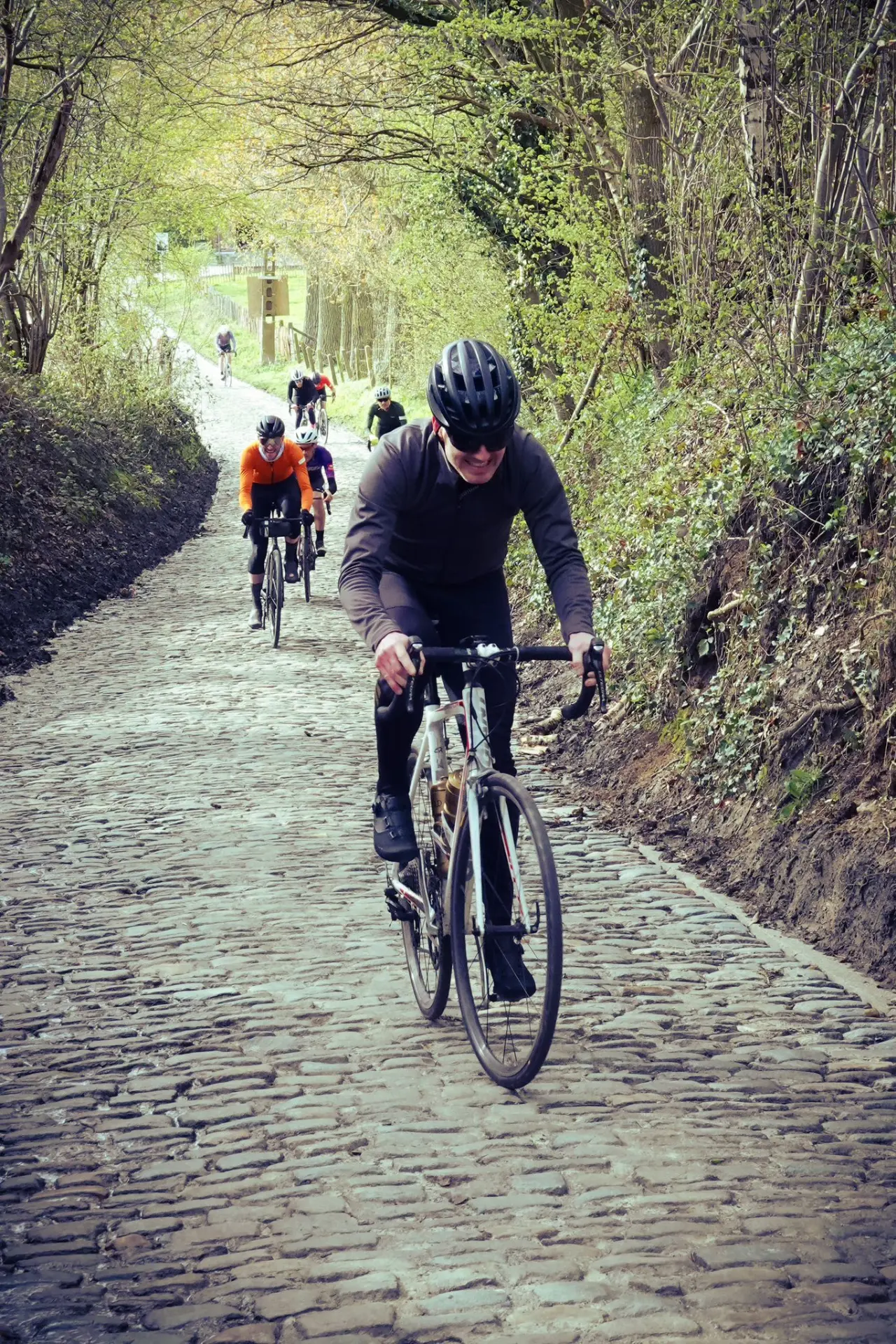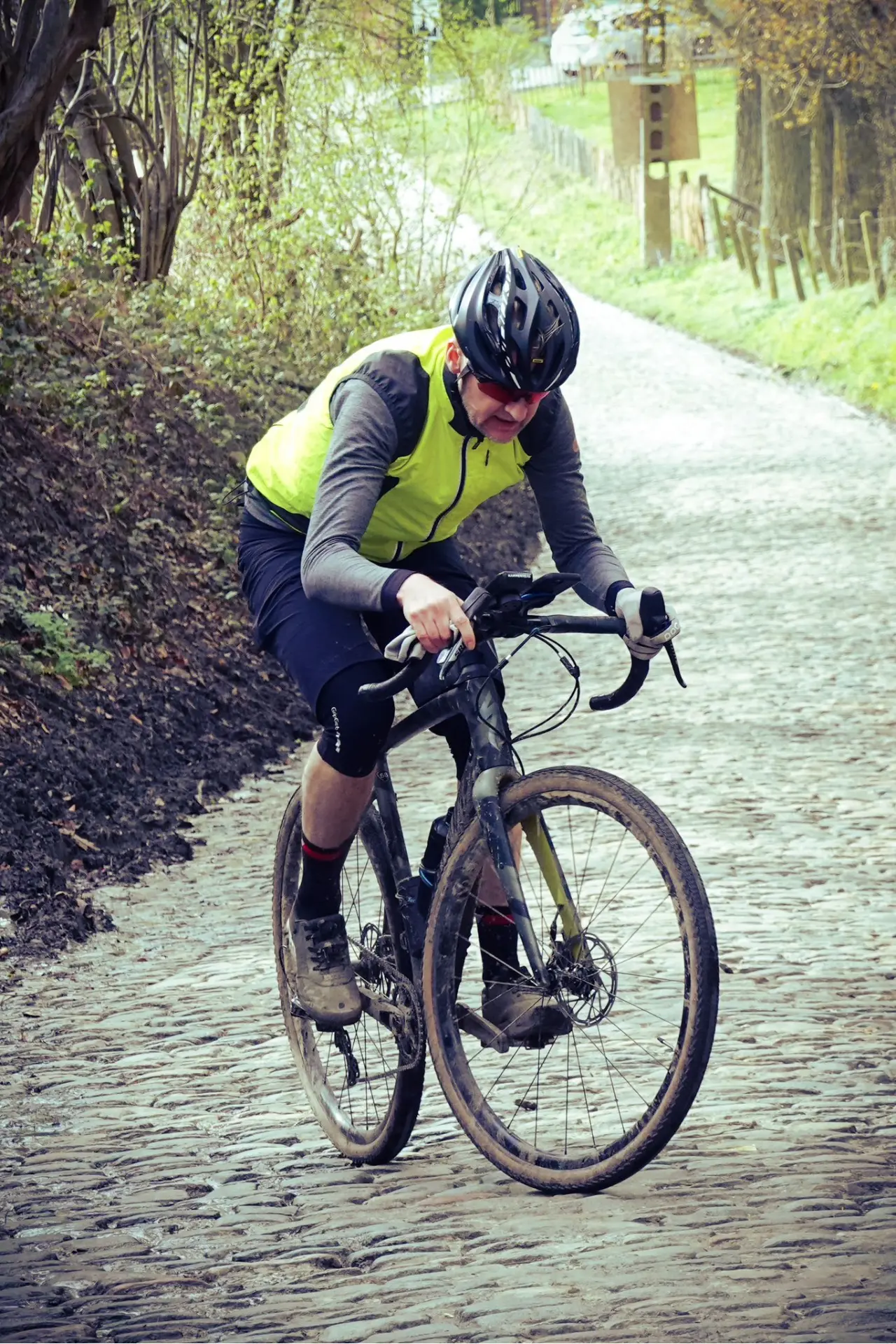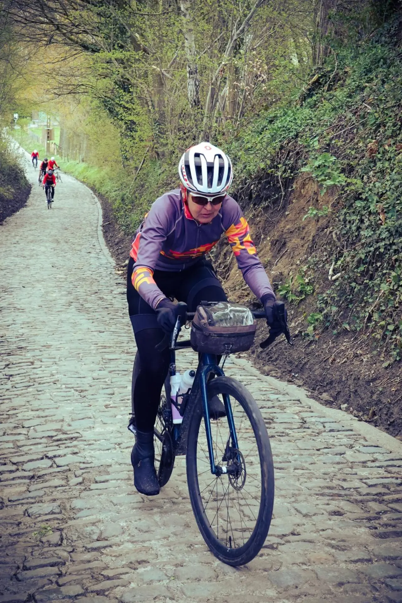 Ronan joined the 90 km group and charged up the Muur van Geraardsbergen. True to form, he was seen tinkering with his cleats every time we paused for a break. Photo: David McCookHup! Hup! to the top of the muur goes David McCook. Photo: Wade WallaceWe don't know what the deal is with the potato — and at this point we're too afraid to ask. Of course, many of you won't have seen the potato and instead have fixated on the Escape x MAAP kit, which Andy van Bergen stress-tested across the cobbles. Kit on sale soon! #AdThere were pain faces aplenty on the Koppenberg, and John Natiw was on hand to capture them all.No trip to Oudenaarde is complete without a visit to the Tour of Flanders Museum. Photo: Dean Murphey