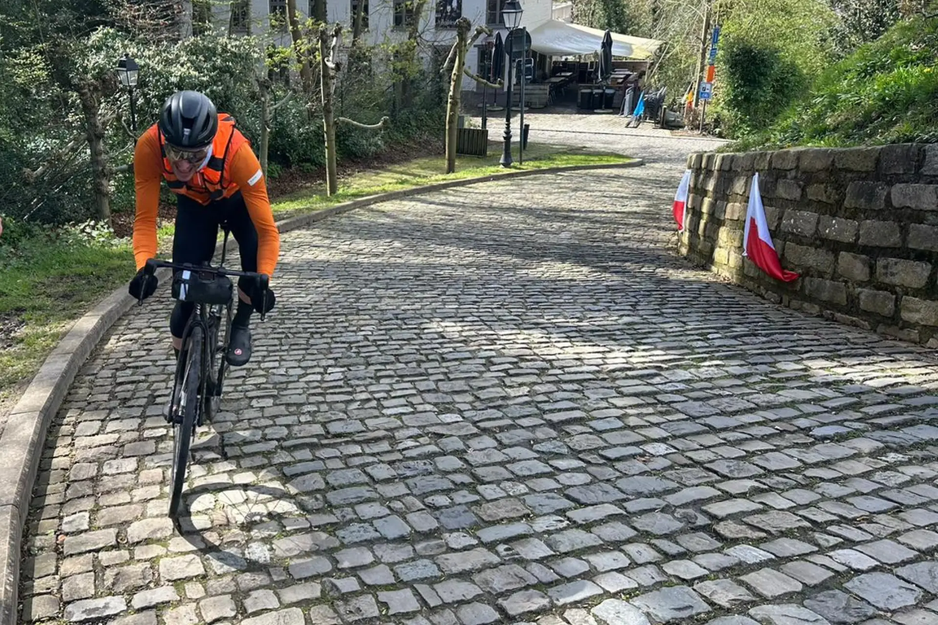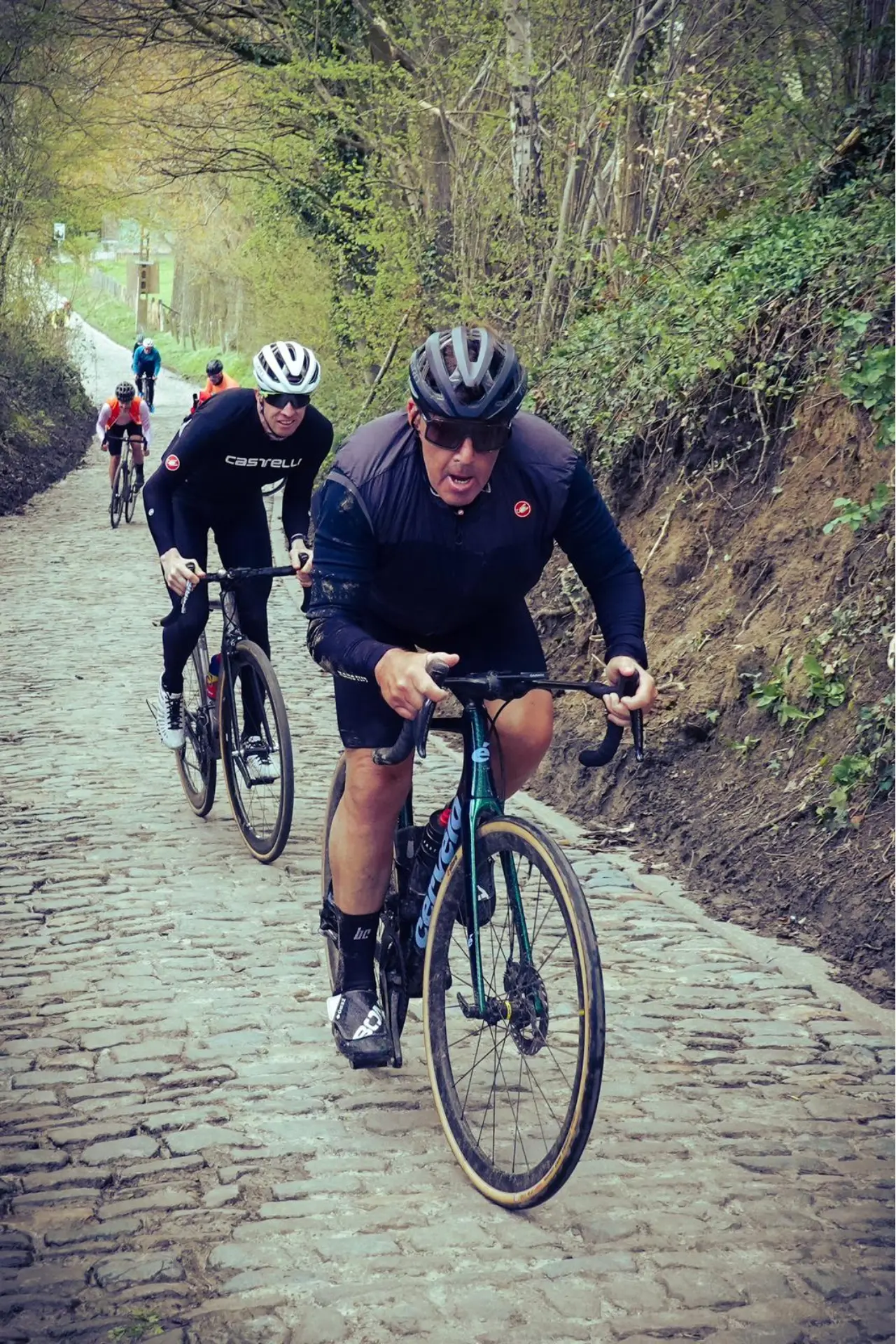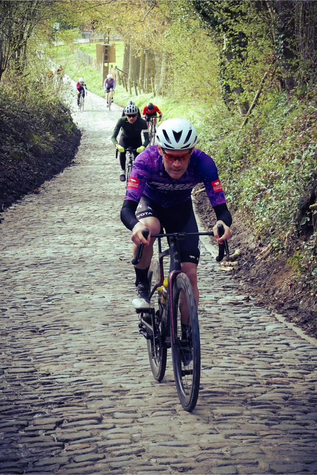 Ronan joined the 90 km group and charged up the Muur van Geraardsbergen. True to form, he was seen tinkering with his cleats every time we paused for a break. Photo: David McCookHup! Hup! to the top of the muur goes David McCook. Photo: Wade WallaceWe don't know what the deal is with the potato — and at this point we're too afraid to ask. Of course, many of you won't have seen the potato and instead have fixated on the Escape x MAAP kit, which Andy van Bergen stress-tested across the cobbles. Kit on sale soon! #AdThere were pain faces aplenty on the Koppenberg, and John Natiw was on hand to capture them all.No trip to Oudenaarde is complete without a visit to the Tour of Flanders Museum. Photo: Dean Murphey