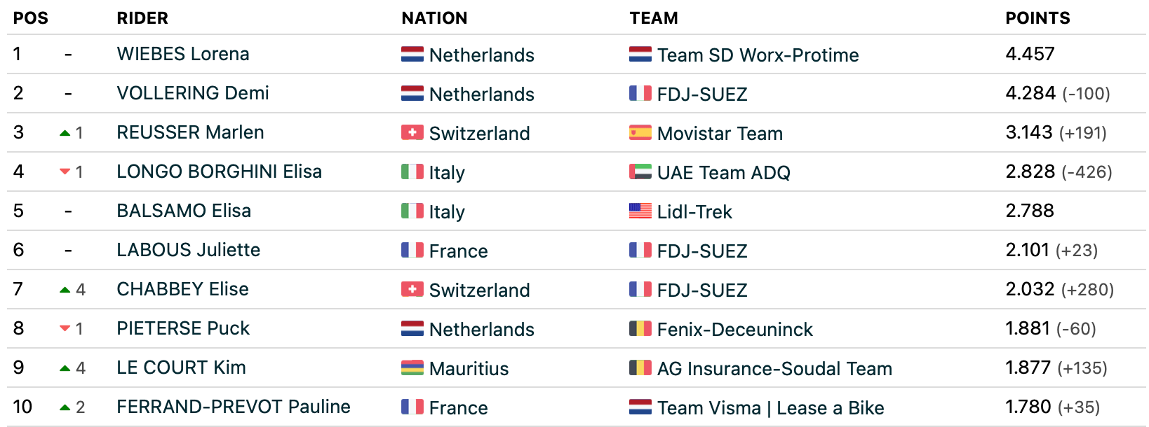 With her wins at the Simac Ladies Tour (all but one of the six stages and the overall) and La Choralis Fourmies in September, Lorena Wiebes took over the top spot in the UCI rankings. She leads by 173 points ahead of Demi Vollering. Marlen Reusser bumped Elisa Longo Borghini out of third with her ITT win at Worlds. The top two spots for the 2025 season are between Wiebes and Vollering, but Reusser, Longo Borghini, and Elisa Balsamo are still in the fight for third.