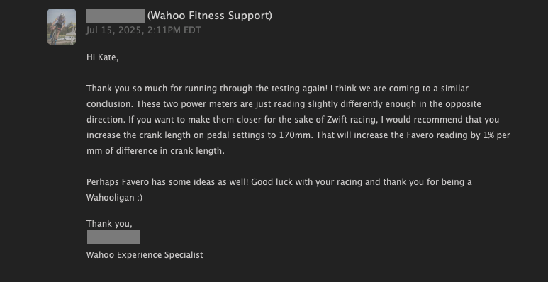 "If you want to make them closer for the sake of Zwift racing, I would recommend that you increase the crank length on pedal settings to 170mm. That will increase the Favero reading by 1% per mm of difference in crank length. Perhaps Favero has some ideas as well! Good luck with your racing and thank you for being a Wahooligan :)"