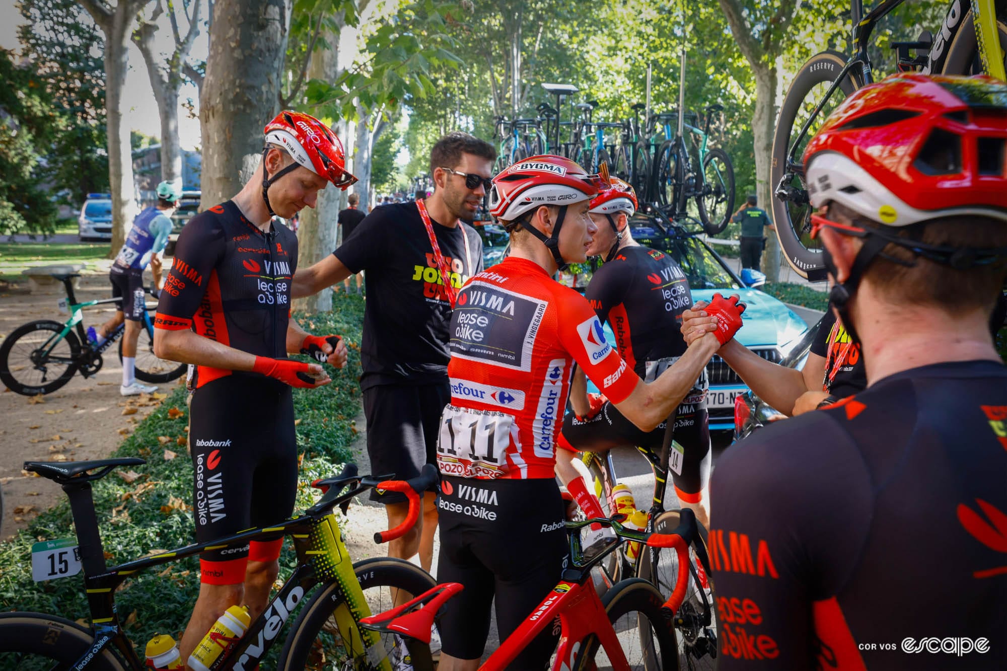 Vingegaard and team dismount and head into the team cars.
