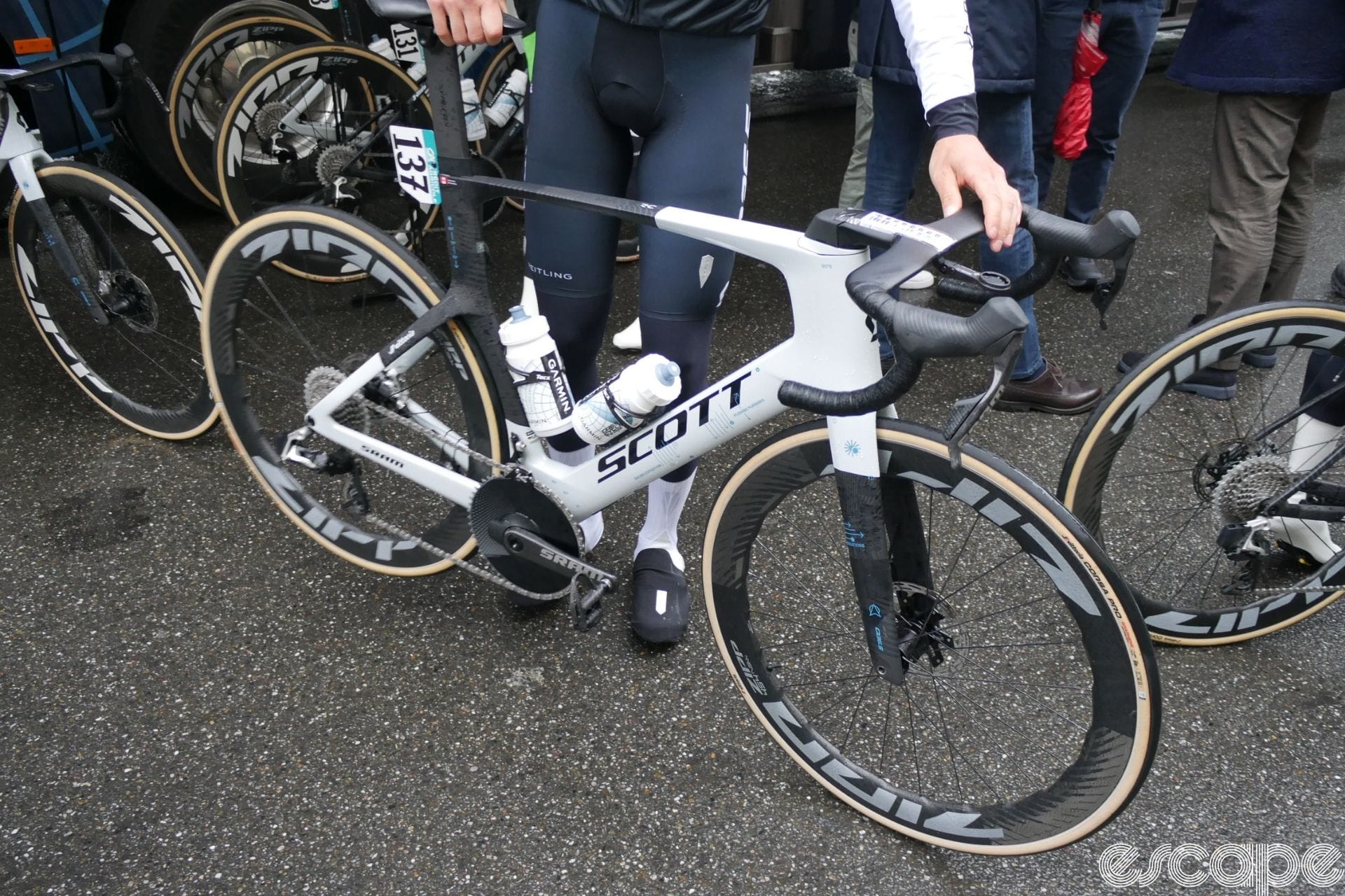 Pidcock bucked the trend of his Q36.5 teammates and decided to use the Addict RC over the Foil RC. With 28 mm Vittoria tyres, 165 mm cranks and a 54-tooth one-by configuration, the bike is packed with current tech trends.