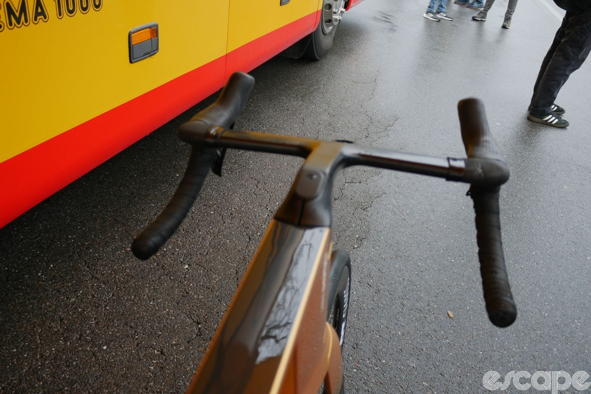 It looks like the team have slowly started receiving the integrated cockpits that create a far smoother, and visibly more aerodynamic front end to the bike. The flowing lines create a seamless transition from the stem to the top tube, with the main bulk of the stem nestled within the footprint of the exceedingly deep headtube.