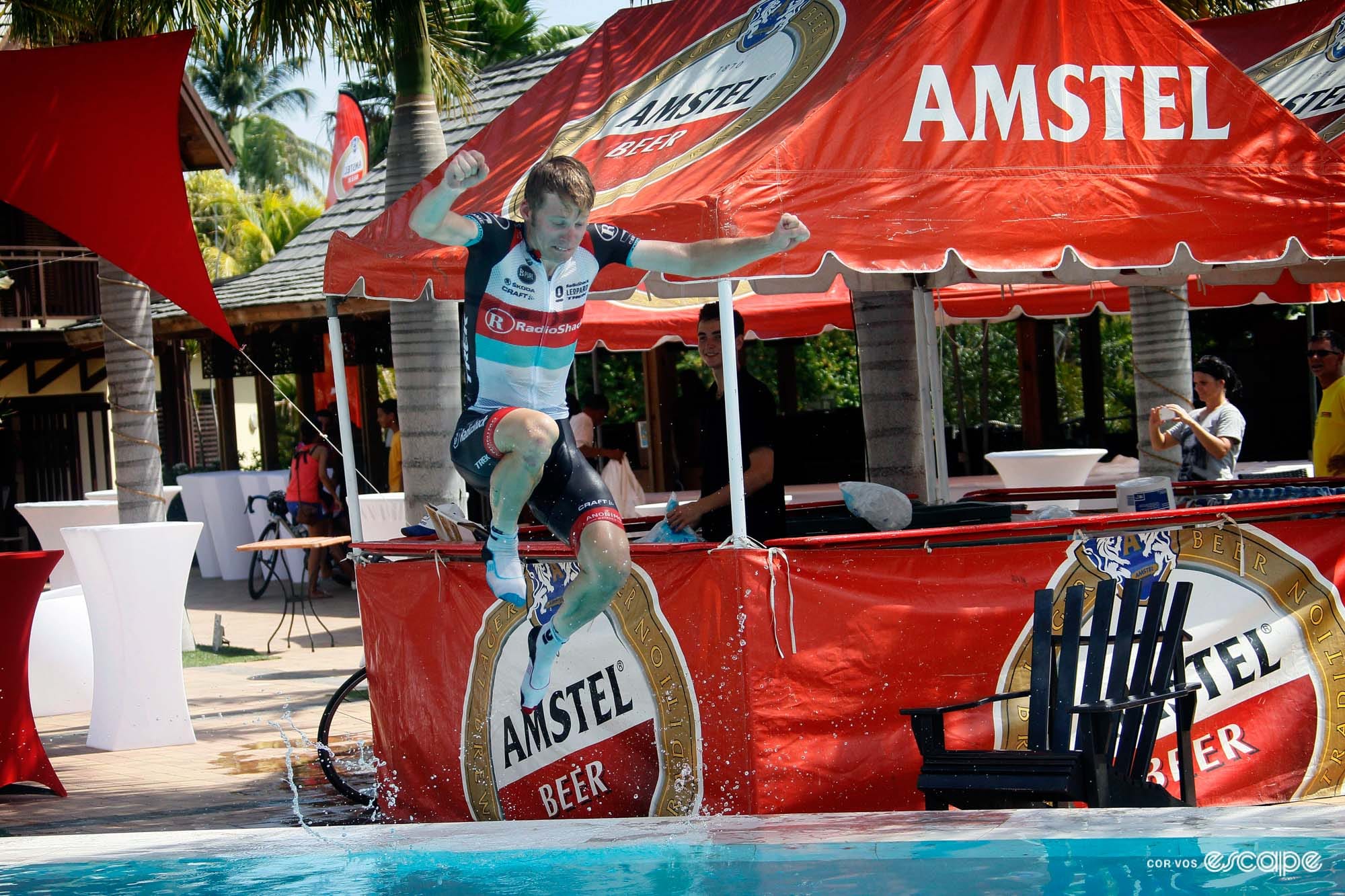 Each November, Vos or his photographers – there's a mix here, some from Cor but many not – would take the 10-hour (domestic!) flight to the island to document the race. I say ‘the race,' but what really has my attention in photos from Amstel Curaçao is pretty much everything besides the race. Instead, we have this bizarre glimpse into a peloton mostly failing to straddle the divide between Serious Sport and Holiday Mode, frame after frame of riders pushing each other into pools and swimming with dolphins.