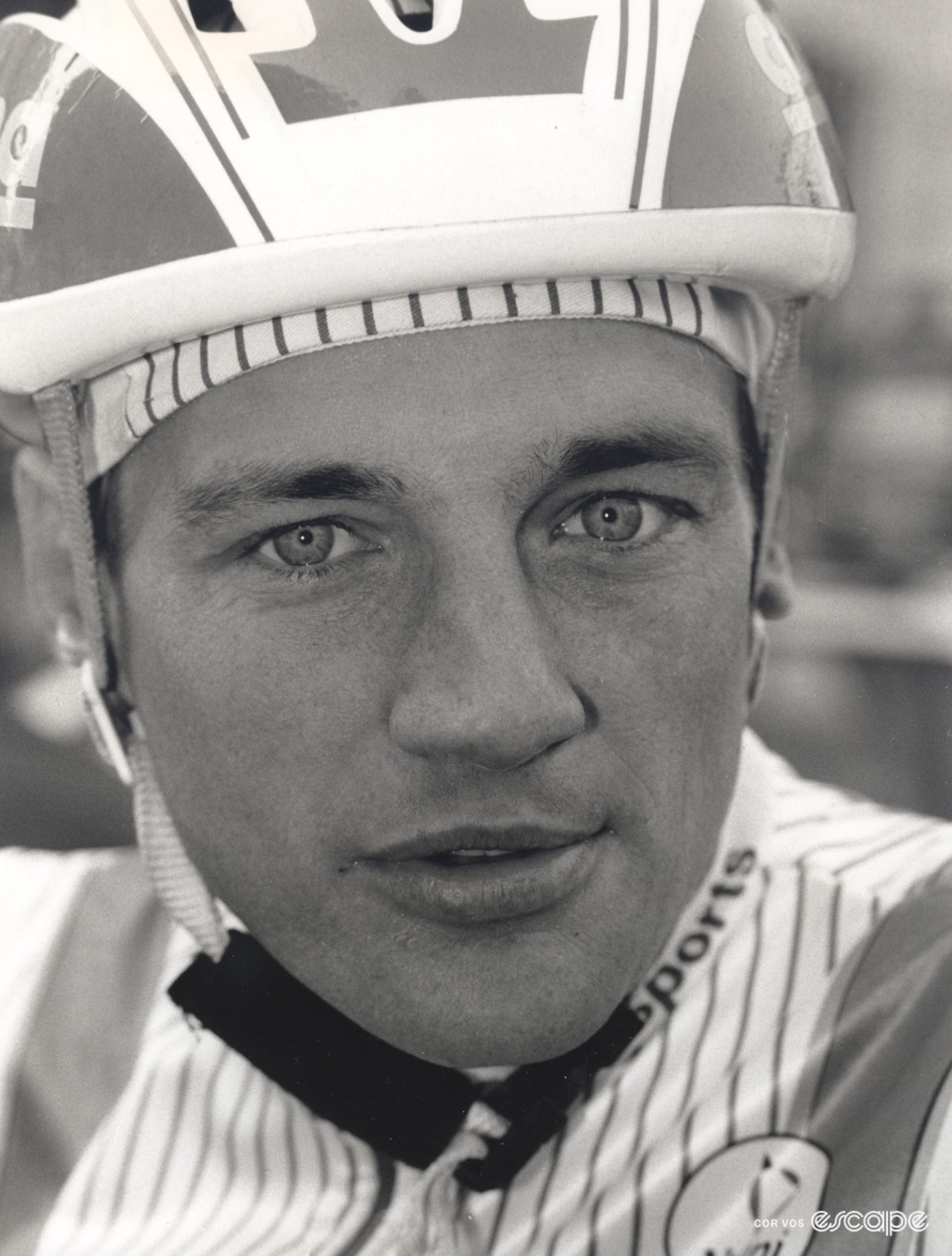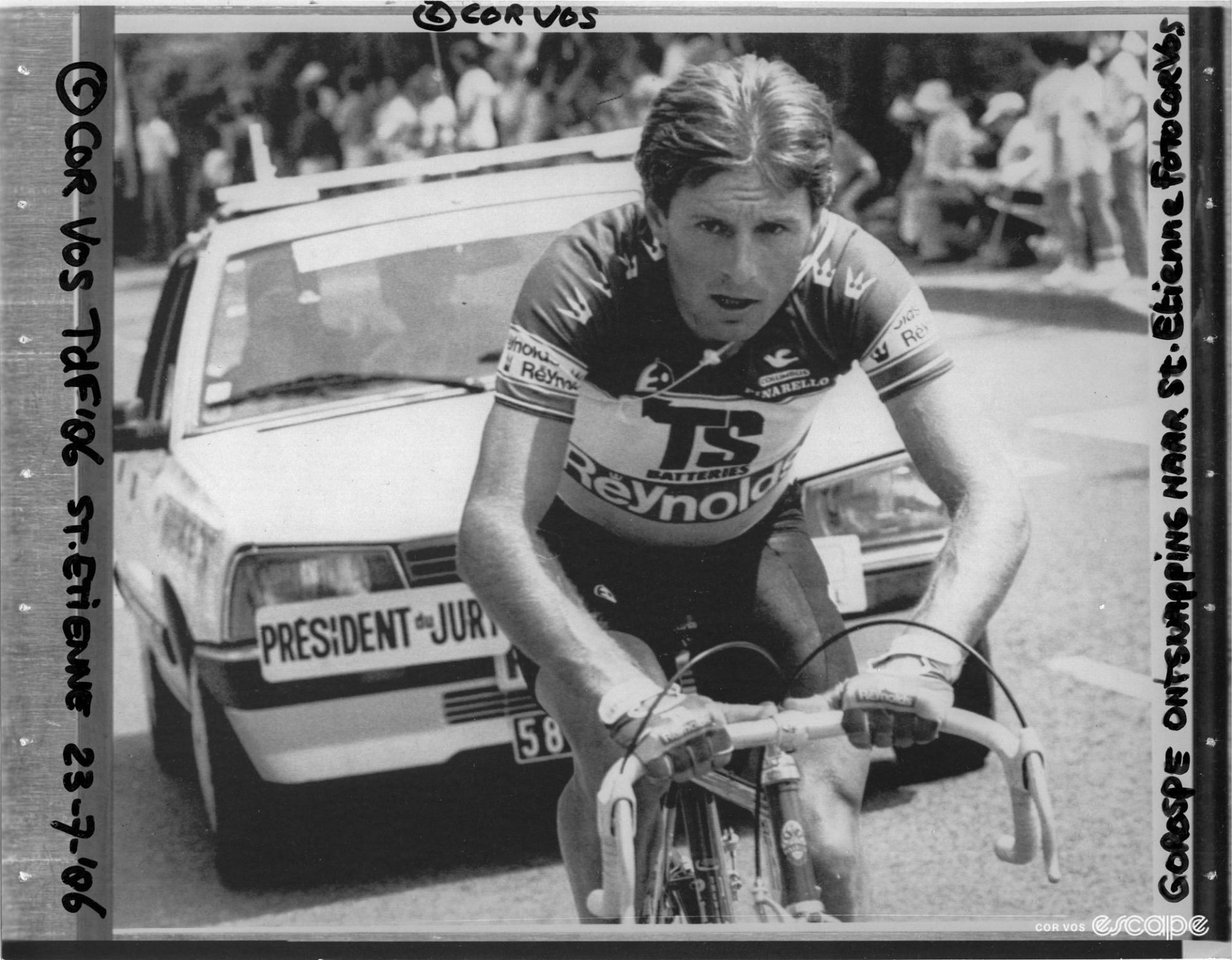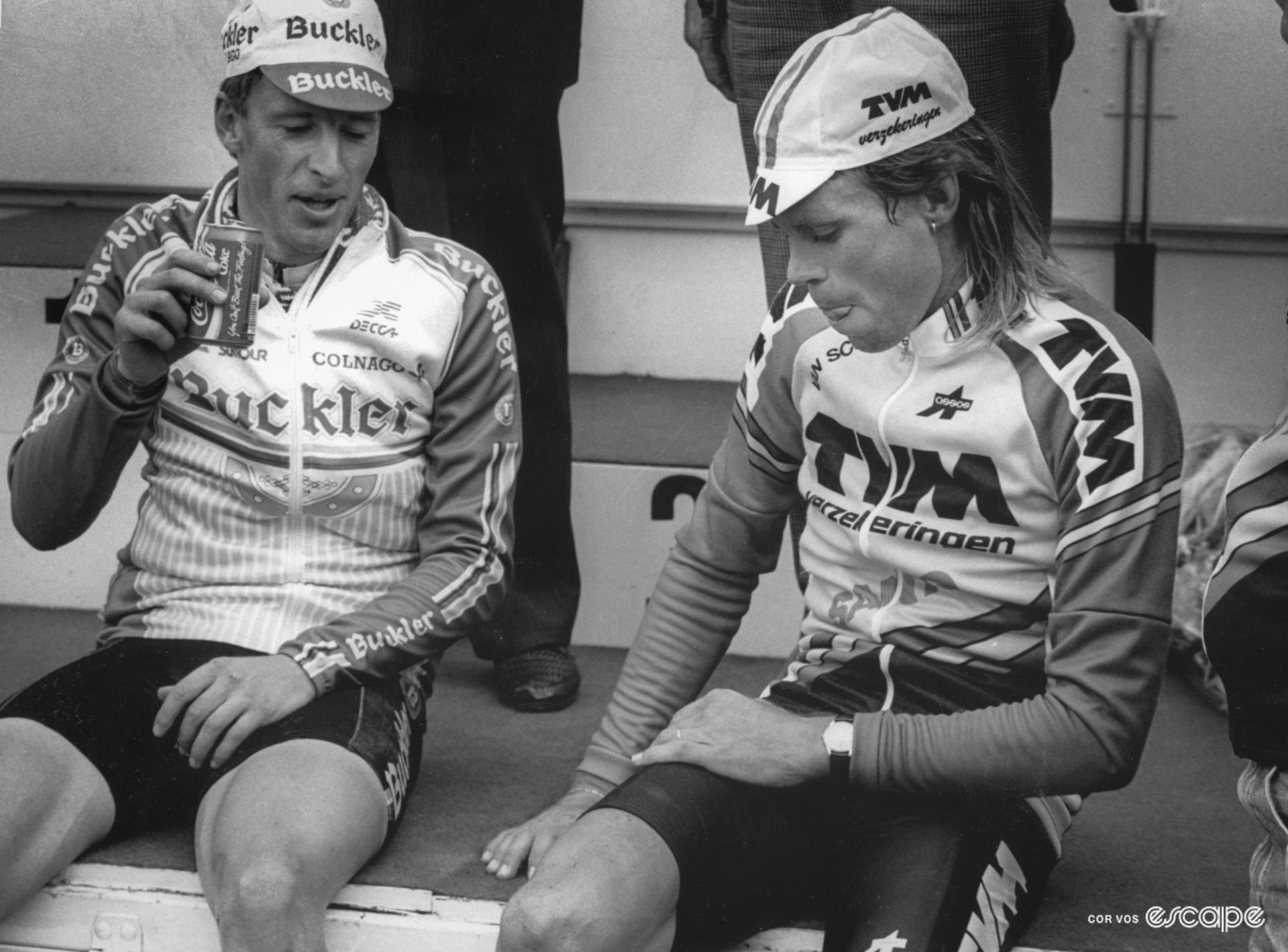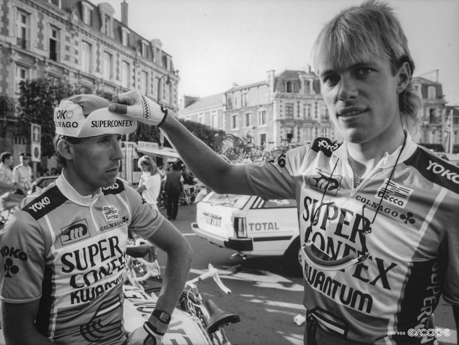 This is the Dutch climber Steven Rooks, pictured at the 1988 Tour de France. I'd never heard of him, probably because I was one year old at the time this picture was taken, but he had a pretty staggering career, finishing second at that year's Tour, winning two stages over the course of his 13-year-long stint as a pro, winning two Dutch championships, Liège-Bastogne-Liège, Amstel Gold, and many many more races.As tends to be the case with riders of this era, many of those results were artificially boosted. He admitted after retirement to having used testosterone and amphetamines throughout his career, bolstering that heady blend with EPO from 1989. In slightly more charming news, the weirdly paparazzi-esque picture of him on Wikipedia is from 2010 and shows that he pootles around on a folding bike sometimes, which is a bit of a vibe. Also a vibe: how he seems to use his Instagram page as a kind of text-heavy newsletter.The cheeky younger man with a mullet is Gert Jakobs, the visibly annoyed older one is Ludo Peeters, and they are having a fun old time together at the 1987 Tour de France. Jakobs is pretty amped about the 'Superconfex' on the brim of the hat – a failed chain of clothing stores that went out of business in 2006. Peeters' career began in 1974, and included – among 42 victories – three Tour de France stage wins and two victories apiece at Paris-Brussels and Paris-Tours. He started a cycling team under his own name in 2012, and I can't find out much more about what he's up to now, other than that he does not appear to be the 'boudoir' photographer (NSFW) of the same name on Instagram. Gert Jakobs is now extremely bald and shiny of head, and in 2020 was very proud of his son for giving an "injured wanderer" some chocolate, cans of soft drink, and cash. "The tramp was very thin, had a black eye and may have been beaten up. They just had to do something for him," Jakobs told a newspaper at the time. As for what the former rider is up to now, he is a charismatic motivational speaker and analyst who will leave "your ears ... ringing at all the fun facts and figures."If this man reminds you of a famous face of today, you're not wrong. It's only bloody Mathieu and David van der Poel's dad, Adrie van der Poel, necking a sparkling water. Over his excellent career, Adrie laid a legacy that his youngest son would go on to stomp all over: a world championship in cyclocross, six classics, two stages of the Tour de France. He also tested positive for strychnine (!) in 1983, which he attributed to a contaminated pigeon pie that Raymond Poulidor had cooked for a family meal. Whew. Today, he's good for a retweet in support of his son's mattress sponsor.Here's Canadian rider Steve Bauer. Bauer is now a director at Israel-Premier Tech, but during his racing career he was staggeringly prodigious. He finished as high as fourth at the Tour de France (1988) and scored a pair of 10th-place finishes in both the Giro and the Tour. I could not be a bigger fan of the La Vie Claire team car, even if it has taken a bit of a knock to the bumper.Luis Herrera was a Colombian climber, who, at the 1987 Vuelta a España, became the first South American to win a Grand Tour. He's been described by Matt Rendell, the leading cycling journalist of all things Colombian and climber-related, as "a slender god [with] tiny, extruded glass limbs," which more or less corresponds exactly with this visual. Before becoming a figurehead of Colombian cycling, he was a gardener, working on a flower plantation. He won the KOM classification in all three Grand Tours, before retiring in 1992. Post-retirement, he has popped up in the news in a couple of interesting ways. In 2000, he was kidnapped by guerillas and held captive for just under a day, before hiking for seven hours to safety. In 2017, meanwhile, he was diagnosed with skin cancer, attributing it to long hours in the saddle without sun protection. The glass-limbed god has lived a life.Laurent Fignon is perhaps best known for losing the 1989 Tour de France to Greg Lemond by just eight seconds on the final-day time trial, but that does a disservice to his palmares. He won the Tour de France twice (1983, 1984), the Giro d'Italia once (1989) and finished third in the Vuelta a España in 1987. In total, he had 10 top-10 Grand Tour finishes, wore lovely little glasses, had a big blonde ponytail, and sadly died of cancer at the age of 50.Gerrit Solleveld (centre; the human man) surrounded by dainty-wristed Michelin mascots (the ones that are Michelin mascots) at an unspecified Tour de France. Solleveld is a two-time Tour stage winner and also scooped up the now-discontinued intermediate sprints red jersey at the 1986 edition of the race. Where is he now? According to his Strava, he's having a lovely holiday in Curaçao.This is the fantastically named Alfons (or, Fons) De Wolf, and he has a sore elbow. De Wolf burst into prominence at the 1979 Vuelta a España where he finished top 10 on GC, won five stages, and won the points classification; a year later he'd pick up his first monument (Il Lombardia) and a few months after that his second (Milan-San Remo). He was saddled with the impossible hype of being 'the next Eddy Merckx' and faded from the mid-'80s, retiring in 1990 and then – this is where my interest really peaks – becoming a car parts sales rep, a PR manager for Mapei, and then a funeral director at his wife's funeral parlour.He currently describes himself on LinkedIn as 'Interim VIP Chauffeur' for the ASO, which doesn't sound very interim seeing as he's been doing it for 13 years.Frans Maassen eyes off Dag Otto Lauritzen's fancy custom helmet. I mean, I'm calling him Frans Maassen, but his full and correct name is the spectacular 'Franciscus Albertus Antonius Johannes Maassen', which really has me questioning my own naming choices as a parent. He made winning the Tour of Luxembourg look cool four years before a little-known American took the honours, and is c
