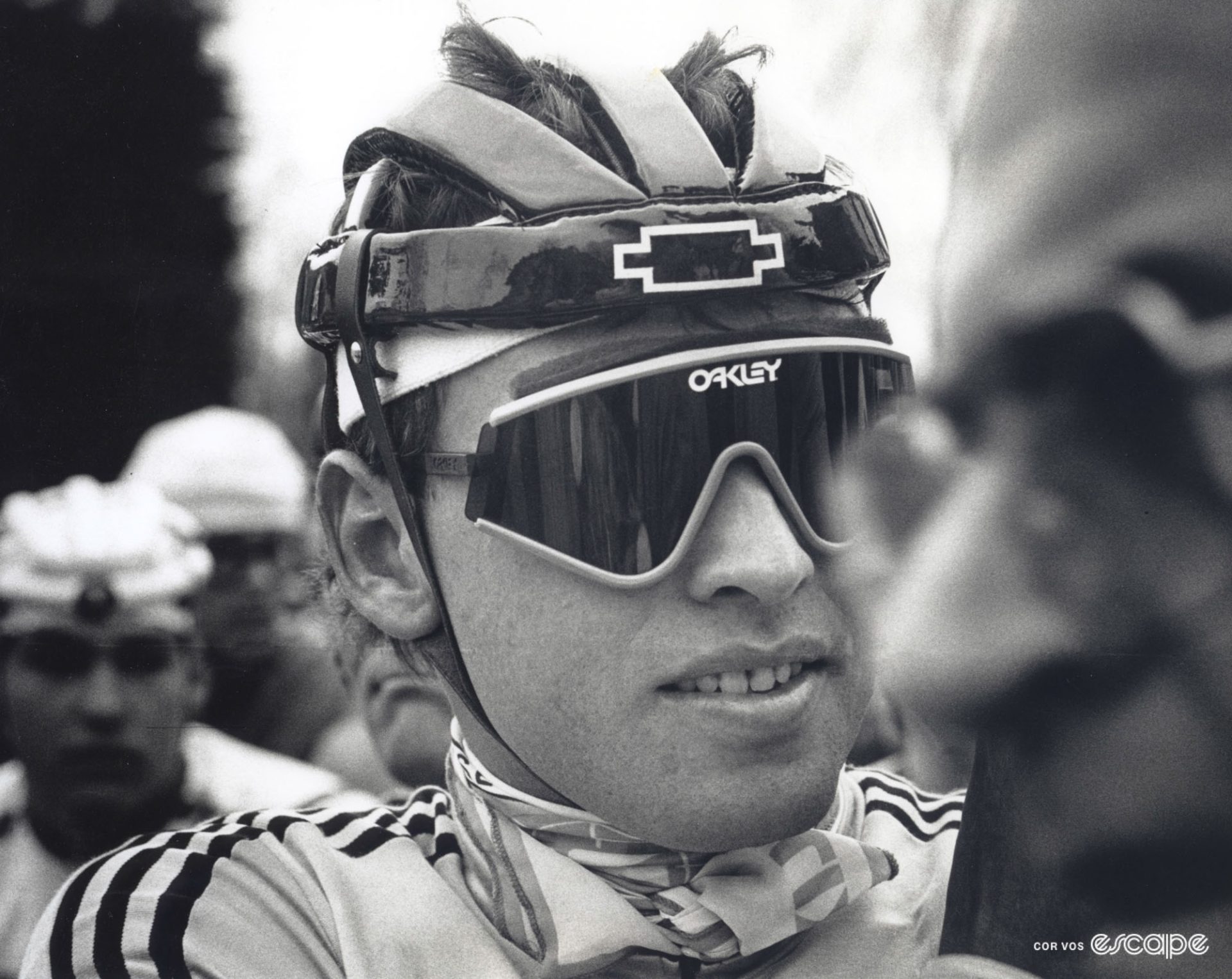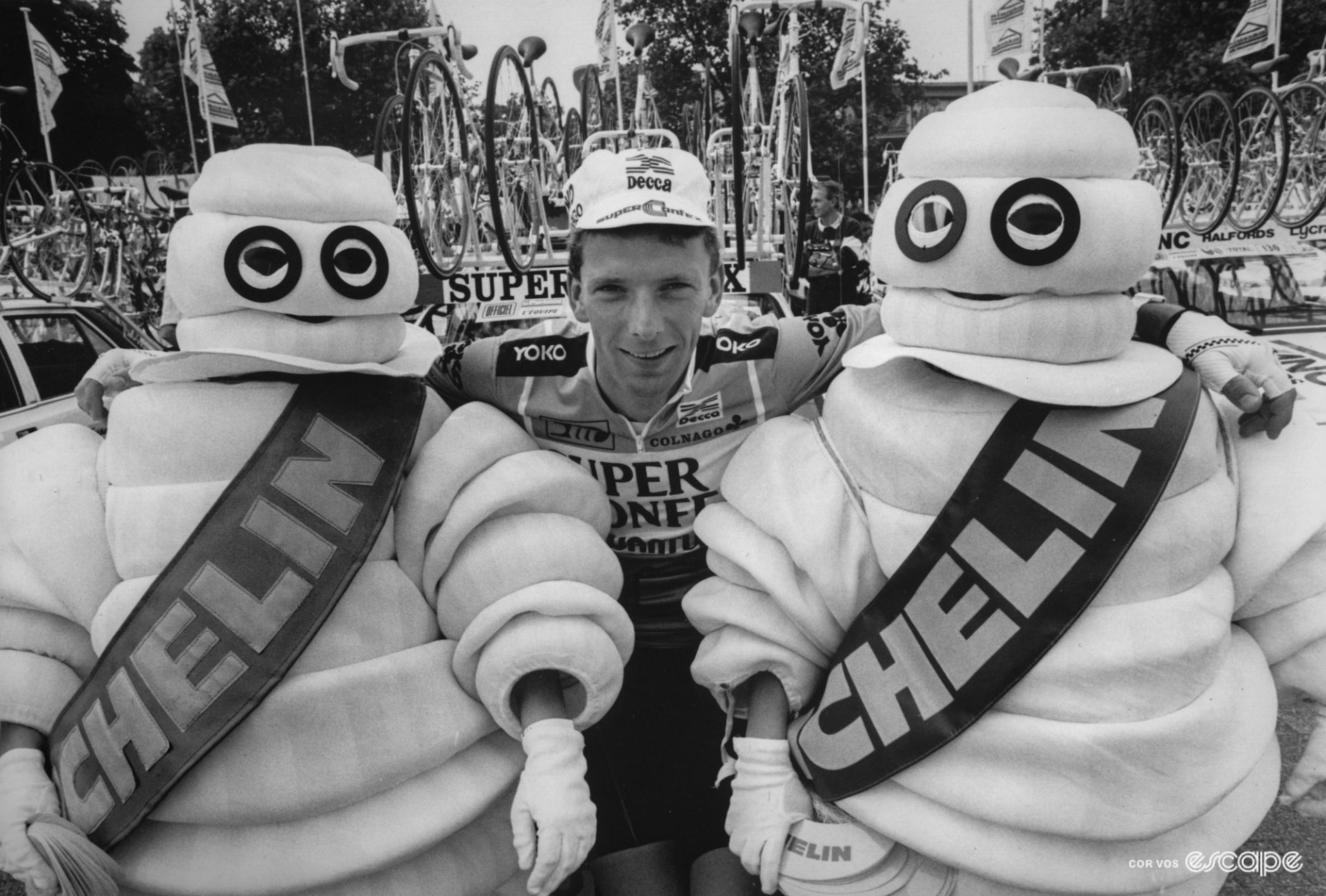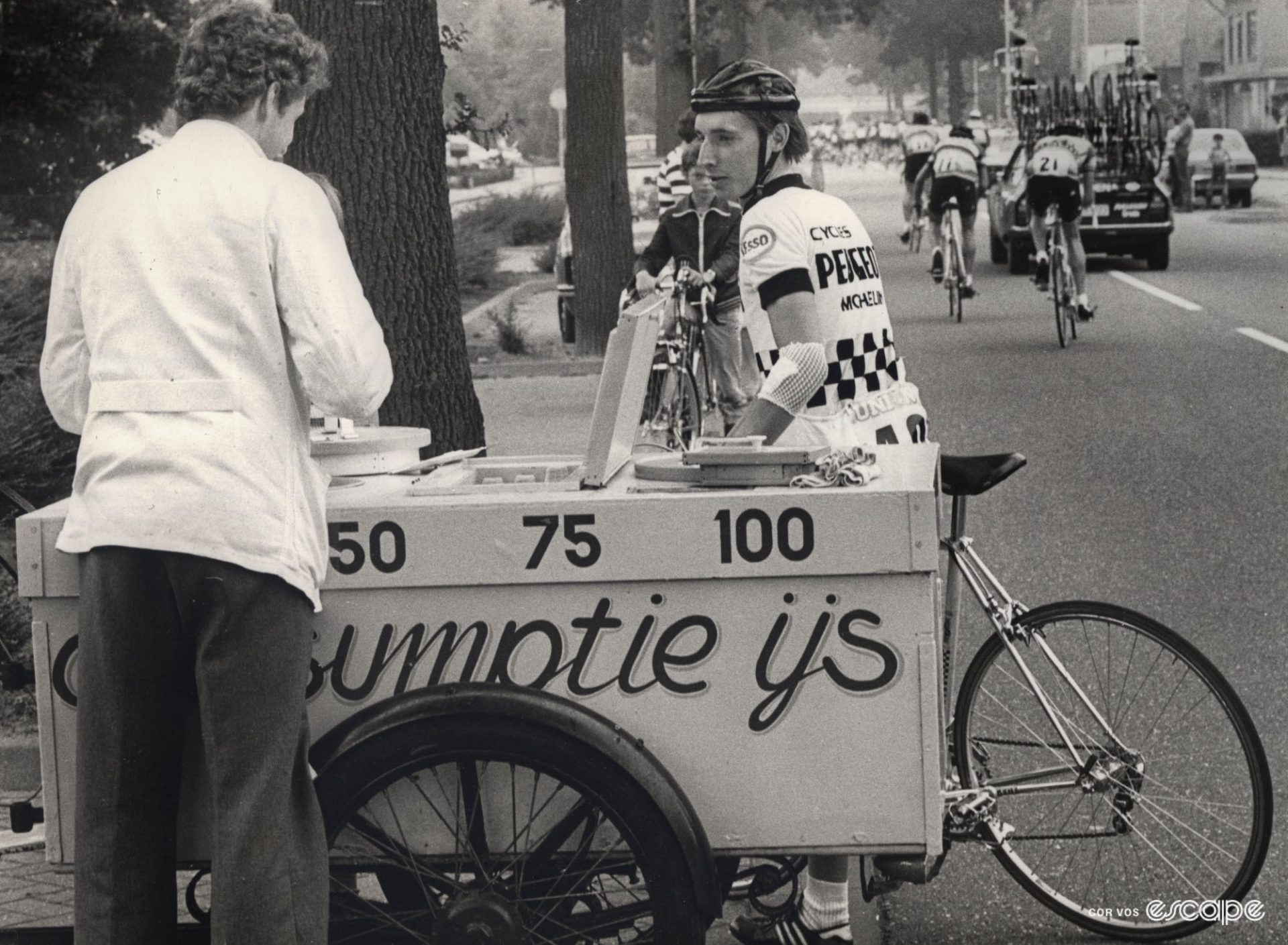 This is the Dutch climber Steven Rooks, pictured at the 1988 Tour de France. I'd never heard of him, probably because I was one year old at the time this picture was taken, but he had a pretty staggering career, finishing second at that year's Tour, winning two stages over the course of his 13-year-long stint as a pro, winning two Dutch championships, Liège-Bastogne-Liège, Amstel Gold, and many many more races.As tends to be the case with riders of this era, many of those results were artificially boosted. He admitted after retirement to having used testosterone and amphetamines throughout his career, bolstering that heady blend with EPO from 1989. In slightly more charming news, the weirdly paparazzi-esque picture of him on Wikipedia is from 2010 and shows that he pootles around on a folding bike sometimes, which is a bit of a vibe. Also a vibe: how he seems to use his Instagram page as a kind of text-heavy newsletter.The cheeky younger man with a mullet is Gert Jakobs, the visibly annoyed older one is Ludo Peeters, and they are having a fun old time together at the 1987 Tour de France. Jakobs is pretty amped about the 'Superconfex' on the brim of the hat – a failed chain of clothing stores that went out of business in 2006. Peeters' career began in 1974, and included – among 42 victories – three Tour de France stage wins and two victories apiece at Paris-Brussels and Paris-Tours. He started a cycling team under his own name in 2012, and I can't find out much more about what he's up to now, other than that he does not appear to be the 'boudoir' photographer (NSFW) of the same name on Instagram. Gert Jakobs is now extremely bald and shiny of head, and in 2020 was very proud of his son for giving an "injured wanderer" some chocolate, cans of soft drink, and cash. "The tramp was very thin, had a black eye and may have been beaten up. They just had to do something for him," Jakobs told a newspaper at the time. As for what the former rider is up to now, he is a charismatic motivational speaker and analyst who will leave "your ears ... ringing at all the fun facts and figures."If this man reminds you of a famous face of today, you're not wrong. It's only bloody Mathieu and David van der Poel's dad, Adrie van der Poel, necking a sparkling water. Over his excellent career, Adrie laid a legacy that his youngest son would go on to stomp all over: a world championship in cyclocross, six classics, two stages of the Tour de France. He also tested positive for strychnine (!) in 1983, which he attributed to a contaminated pigeon pie that Raymond Poulidor had cooked for a family meal. Whew. Today, he's good for a retweet in support of his son's mattress sponsor.Here's Canadian rider Steve Bauer. Bauer is now a director at Israel-Premier Tech, but during his racing career he was staggeringly prodigious. He finished as high as fourth at the Tour de France (1988) and scored a pair of 10th-place finishes in both the Giro and the Tour. I could not be a bigger fan of the La Vie Claire team car, even if it has taken a bit of a knock to the bumper.Luis Herrera was a Colombian climber, who, at the 1987 Vuelta a España, became the first South American to win a Grand Tour. He's been described by Matt Rendell, the leading cycling journalist of all things Colombian and climber-related, as "a slender god [with] tiny, extruded glass limbs," which more or less corresponds exactly with this visual. Before becoming a figurehead of Colombian cycling, he was a gardener, working on a flower plantation. He won the KOM classification in all three Grand Tours, before retiring in 1992. Post-retirement, he has popped up in the news in a couple of interesting ways. In 2000, he was kidnapped by guerillas and held captive for just under a day, before hiking for seven hours to safety. In 2017, meanwhile, he was diagnosed with skin cancer, attributing it to long hours in the saddle without sun protection. The glass-limbed god has lived a life.Laurent Fignon is perhaps best known for losing the 1989 Tour de France to Greg Lemond by just eight seconds on the final-day time trial, but that does a disservice to his palmares. He won the Tour de France twice (1983, 1984), the Giro d'Italia once (1989) and finished third in the Vuelta a España in 1987. In total, he had 10 top-10 Grand Tour finishes, wore lovely little glasses, had a big blonde ponytail, and sadly died of cancer at the age of 50.Gerrit Solleveld (centre; the human man) surrounded by dainty-wristed Michelin mascots (the ones that are Michelin mascots) at an unspecified Tour de France. Solleveld is a two-time Tour stage winner and also scooped up the now-discontinued intermediate sprints red jersey at the 1986 edition of the race. Where is he now? According to his Strava, he's having a lovely holiday in Curaçao.This is the fantastically named Alfons (or, Fons) De Wolf, and he has a sore elbow. De Wolf burst into prominence at the 1979 Vuelta a España where he finished top 10 on GC, won five stages, and won the points classification; a year later he'd pick up his first monument (Il Lombardia) and a few months after that his second (Milan-San Remo). He was saddled with the impossible hype of being 'the next Eddy Merckx' and faded from the mid-'80s, retiring in 1990 and then – this is where my interest really peaks – becoming a car parts sales rep, a PR manager for Mapei, and then a funeral director at his wife's funeral parlour.He currently describes himself on LinkedIn as 'Interim VIP Chauffeur' for the ASO, which doesn't sound very interim seeing as he's been doing it for 13 years.Frans Maassen eyes off Dag Otto Lauritzen's fancy custom helmet. I mean, I'm calling him Frans Maassen, but his full and correct name is the spectacular 'Franciscus Albertus Antonius Johannes Maassen', which really has me questioning my own naming choices as a parent. He made winning the Tour of Luxembourg look cool four years before a little-known American took the honours, and is c