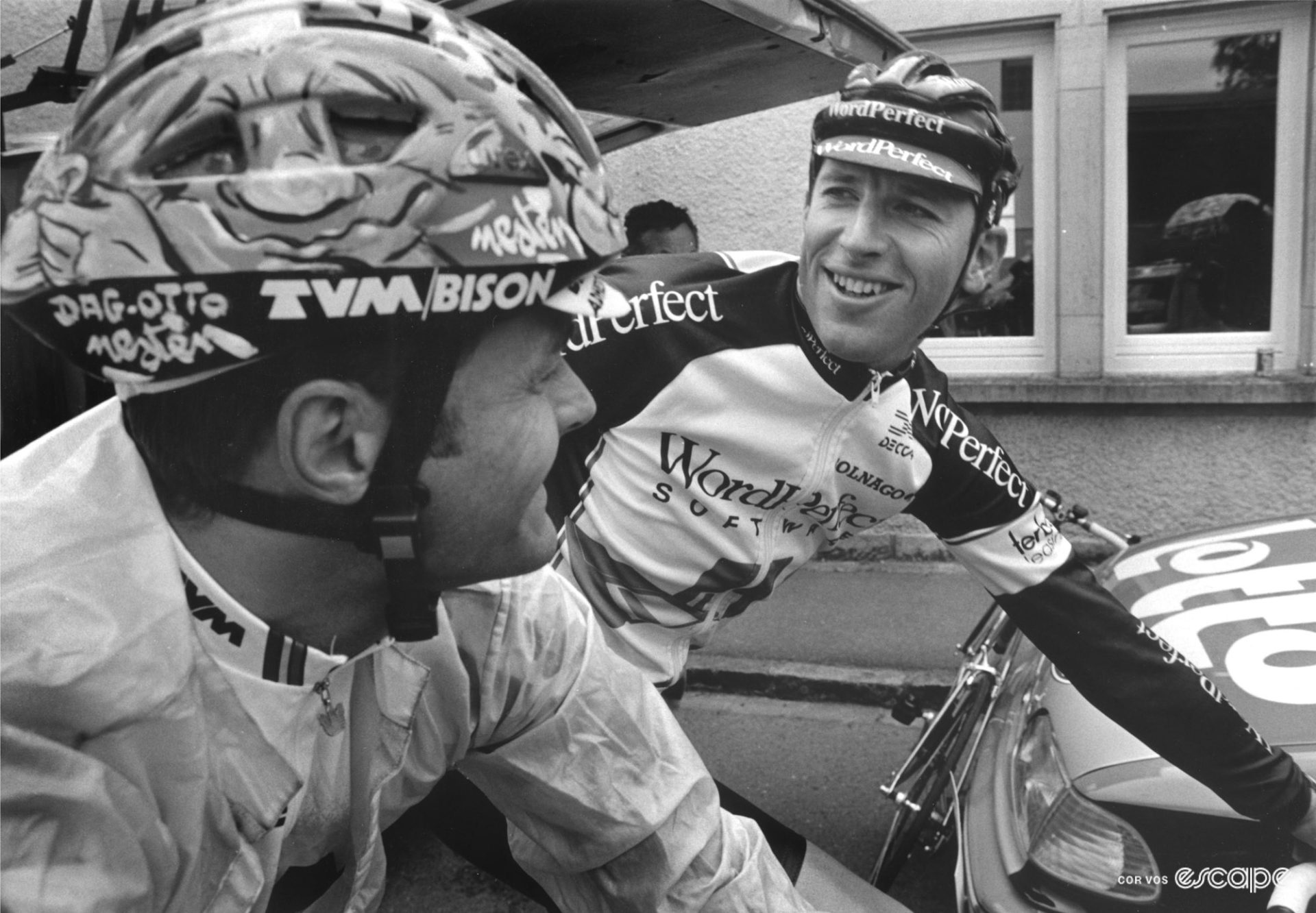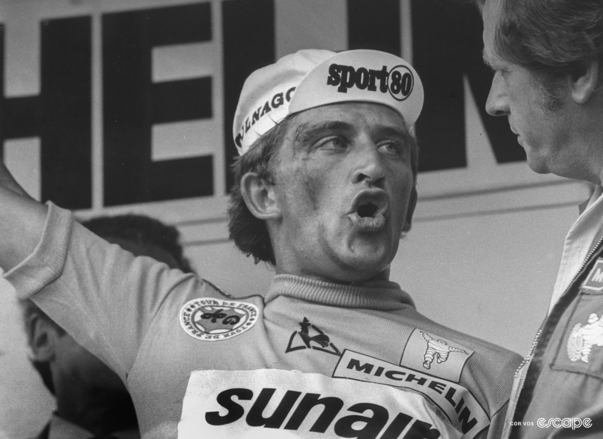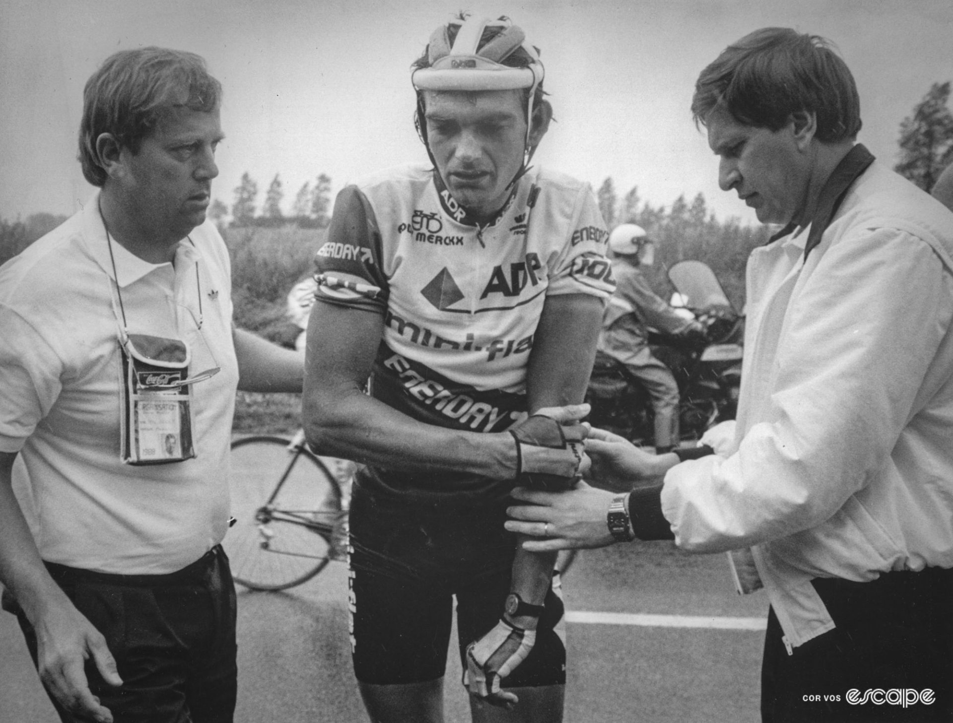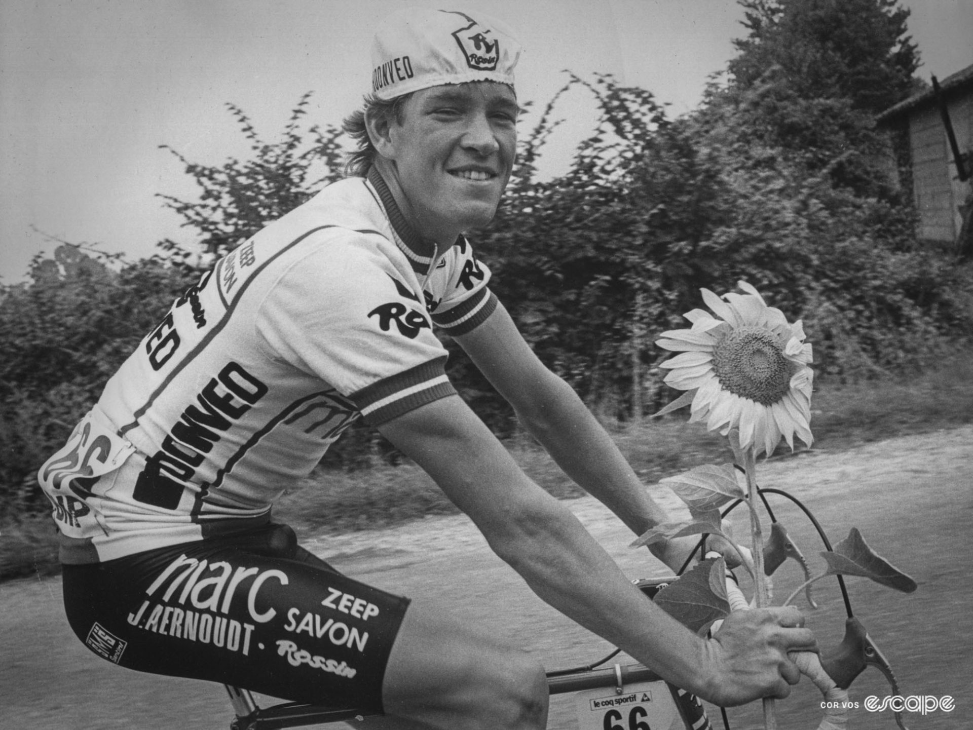 This is the Dutch climber Steven Rooks, pictured at the 1988 Tour de France. I'd never heard of him, probably because I was one year old at the time this picture was taken, but he had a pretty staggering career, finishing second at that year's Tour, winning two stages over the course of his 13-year-long stint as a pro, winning two Dutch championships, Liège-Bastogne-Liège, Amstel Gold, and many many more races.As tends to be the case with riders of this era, many of those results were artificially boosted. He admitted after retirement to having used testosterone and amphetamines throughout his career, bolstering that heady blend with EPO from 1989. In slightly more charming news, the weirdly paparazzi-esque picture of him on Wikipedia is from 2010 and shows that he pootles around on a folding bike sometimes, which is a bit of a vibe. Also a vibe: how he seems to use his Instagram page as a kind of text-heavy newsletter.The cheeky younger man with a mullet is Gert Jakobs, the visibly annoyed older one is Ludo Peeters, and they are having a fun old time together at the 1987 Tour de France. Jakobs is pretty amped about the 'Superconfex' on the brim of the hat – a failed chain of clothing stores that went out of business in 2006. Peeters' career began in 1974, and included – among 42 victories – three Tour de France stage wins and two victories apiece at Paris-Brussels and Paris-Tours. He started a cycling team under his own name in 2012, and I can't find out much more about what he's up to now, other than that he does not appear to be the 'boudoir' photographer (NSFW) of the same name on Instagram. Gert Jakobs is now extremely bald and shiny of head, and in 2020 was very proud of his son for giving an "injured wanderer" some chocolate, cans of soft drink, and cash. "The tramp was very thin, had a black eye and may have been beaten up. They just had to do something for him," Jakobs told a newspaper at the time. As for what the former rider is up to now, he is a charismatic motivational speaker and analyst who will leave "your ears ... ringing at all the fun facts and figures."If this man reminds you of a famous face of today, you're not wrong. It's only bloody Mathieu and David van der Poel's dad, Adrie van der Poel, necking a sparkling water. Over his excellent career, Adrie laid a legacy that his youngest son would go on to stomp all over: a world championship in cyclocross, six classics, two stages of the Tour de France. He also tested positive for strychnine (!) in 1983, which he attributed to a contaminated pigeon pie that Raymond Poulidor had cooked for a family meal. Whew. Today, he's good for a retweet in support of his son's mattress sponsor.Here's Canadian rider Steve Bauer. Bauer is now a director at Israel-Premier Tech, but during his racing career he was staggeringly prodigious. He finished as high as fourth at the Tour de France (1988) and scored a pair of 10th-place finishes in both the Giro and the Tour. I could not be a bigger fan of the La Vie Claire team car, even if it has taken a bit of a knock to the bumper.Luis Herrera was a Colombian climber, who, at the 1987 Vuelta a España, became the first South American to win a Grand Tour. He's been described by Matt Rendell, the leading cycling journalist of all things Colombian and climber-related, as "a slender god [with] tiny, extruded glass limbs," which more or less corresponds exactly with this visual. Before becoming a figurehead of Colombian cycling, he was a gardener, working on a flower plantation. He won the KOM classification in all three Grand Tours, before retiring in 1992. Post-retirement, he has popped up in the news in a couple of interesting ways. In 2000, he was kidnapped by guerillas and held captive for just under a day, before hiking for seven hours to safety. In 2017, meanwhile, he was diagnosed with skin cancer, attributing it to long hours in the saddle without sun protection. The glass-limbed god has lived a life.Laurent Fignon is perhaps best known for losing the 1989 Tour de France to Greg Lemond by just eight seconds on the final-day time trial, but that does a disservice to his palmares. He won the Tour de France twice (1983, 1984), the Giro d'Italia once (1989) and finished third in the Vuelta a España in 1987. In total, he had 10 top-10 Grand Tour finishes, wore lovely little glasses, had a big blonde ponytail, and sadly died of cancer at the age of 50.Gerrit Solleveld (centre; the human man) surrounded by dainty-wristed Michelin mascots (the ones that are Michelin mascots) at an unspecified Tour de France. Solleveld is a two-time Tour stage winner and also scooped up the now-discontinued intermediate sprints red jersey at the 1986 edition of the race. Where is he now? According to his Strava, he's having a lovely holiday in Curaçao.This is the fantastically named Alfons (or, Fons) De Wolf, and he has a sore elbow. De Wolf burst into prominence at the 1979 Vuelta a España where he finished top 10 on GC, won five stages, and won the points classification; a year later he'd pick up his first monument (Il Lombardia) and a few months after that his second (Milan-San Remo). He was saddled with the impossible hype of being 'the next Eddy Merckx' and faded from the mid-'80s, retiring in 1990 and then – this is where my interest really peaks – becoming a car parts sales rep, a PR manager for Mapei, and then a funeral director at his wife's funeral parlour.He currently describes himself on LinkedIn as 'Interim VIP Chauffeur' for the ASO, which doesn't sound very interim seeing as he's been doing it for 13 years.Frans Maassen eyes off Dag Otto Lauritzen's fancy custom helmet. I mean, I'm calling him Frans Maassen, but his full and correct name is the spectacular 'Franciscus Albertus Antonius Johannes Maassen', which really has me questioning my own naming choices as a parent. He made winning the Tour of Luxembourg look cool four years before a little-known American took the honours, and is c