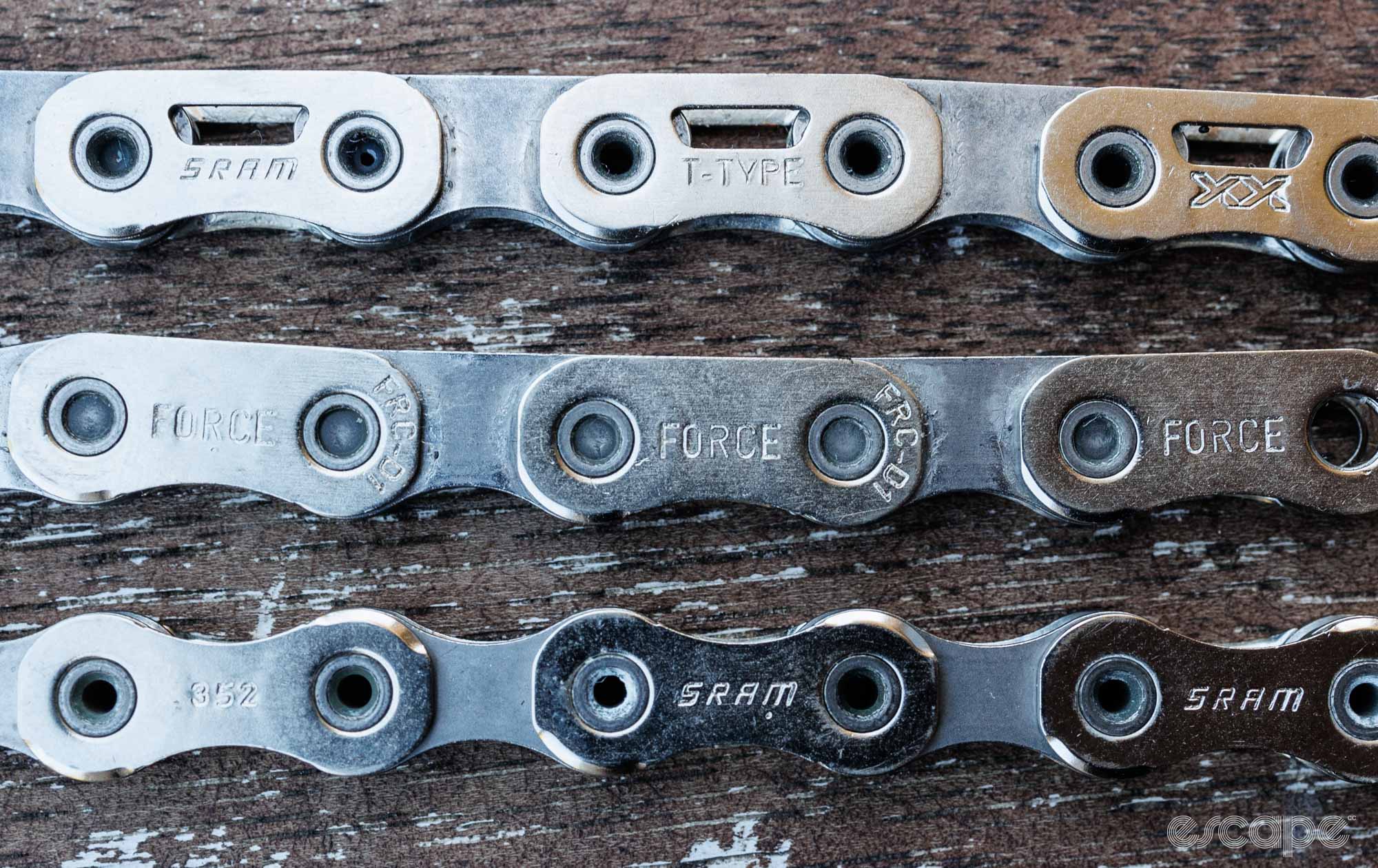 From top to bottom: SRAM T-Type, SRAM Flat Top, and SRAM Eagle. Yes, SRAM now has three versions of 12-speed chain that are supposedly incompatible with one another.