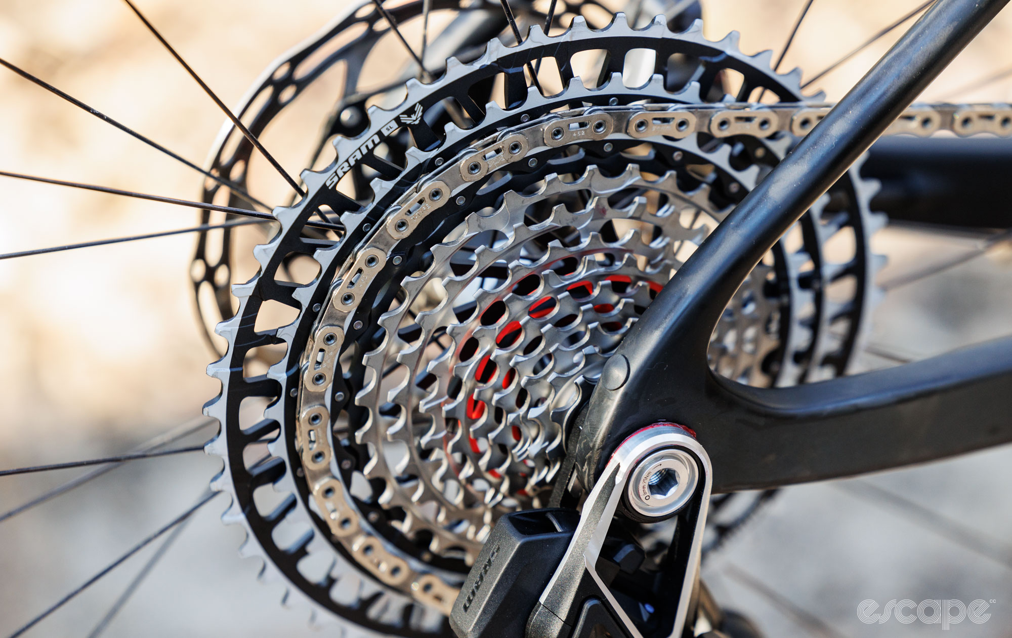 To add a Donnie Darko-level of consumer confusion into the matter, SRAM states that its 1x12 AXS Road chainrings are cross-compatible with the T-type chain (to make a mullet-style gravel bike). And if that didn’t raise an eyebrow, get this: the new T-Type chainrings are also backward compatible with older Eagle drivetrains, too. I’m left scratching a hole in my head over this supposed chain incompatibility.