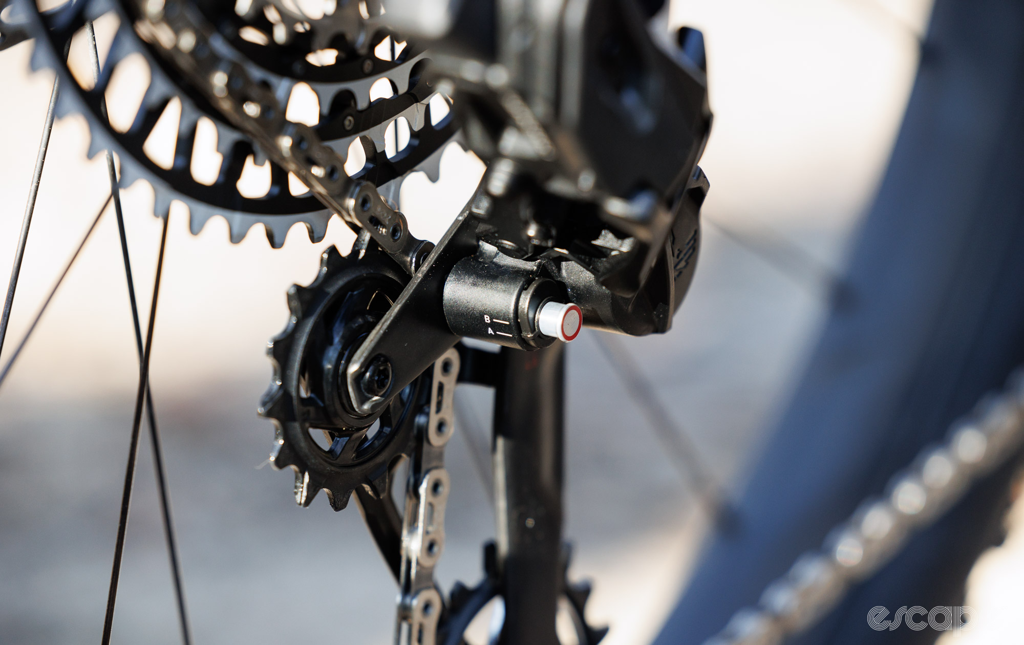 The equivalent of B-tension adjustment is now done with a new tool-free “Setup Key” at the derailleur cage when first installing the derailleur. Meanwhile, the only other adjustment available is the electronic trim that moves the derailleur side-to-side in 0.2 mm increments. Interestingly, the trim is only needed because the width of the hub axle end cap is the only part of the puzzle that SRAM hasn’t been able to standardise.
