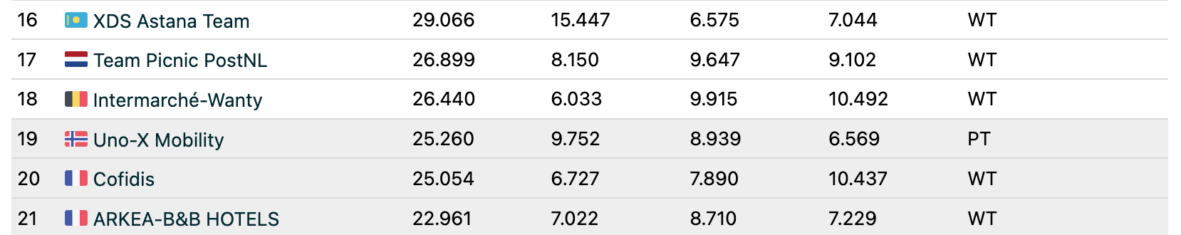 And at first glance, as we can see on FirstCycling's useful live tracker, the race for 18th doesn't seem overly exciting. With only three weeks left in the WorldTour and ProTour seasons, Intermarché-Wanty lead Uno-X Mobility by well over 1,000 points.